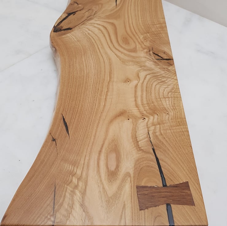 The natural splits in the wood have been filled with black epoxy, complemented by a sweet chestnut timber bow tie.