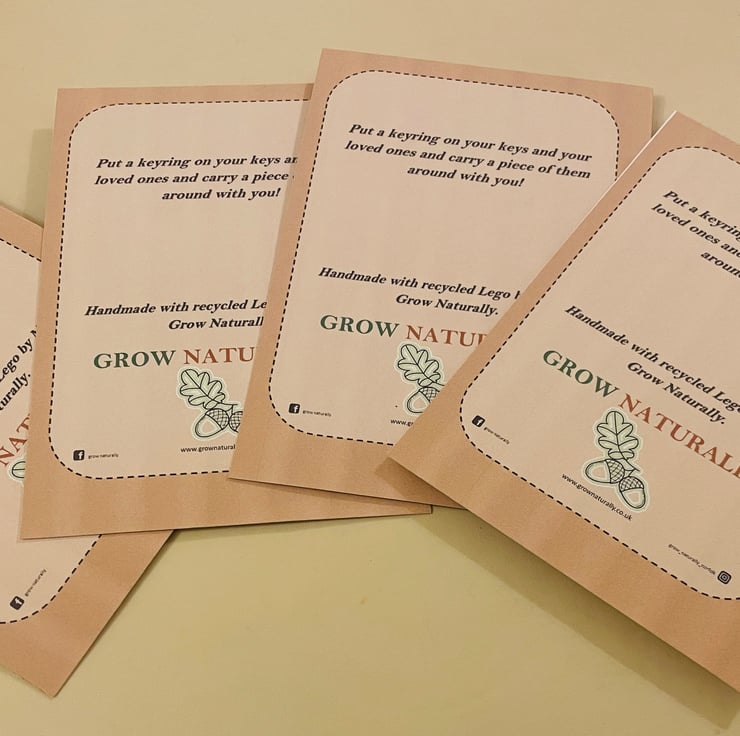 Recycled Lego mounted but removable, on a blank card. The two Lego pieces clip together to make a heart and then unclip to make two keyrings. The inside of the card is blank