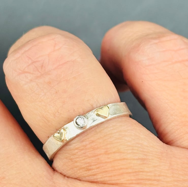 This Diamond Ring has been handcrafted by Michelle using Sterling Silver, solid 9ct yellow gold and features a natural, round 2mm wide diamond. The hammered band has been given a matt satin finish which contrasts beautifully with the shiny gold hearts. If you would prefer the silver to be shiny please let Michelle know at Checkout. Michelle can make this ring in any size so please leave your size details at Checkout.