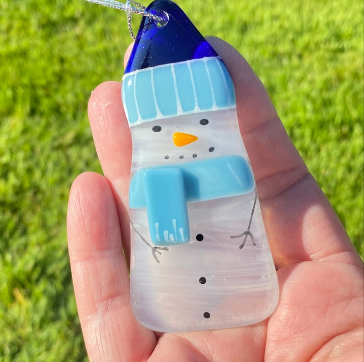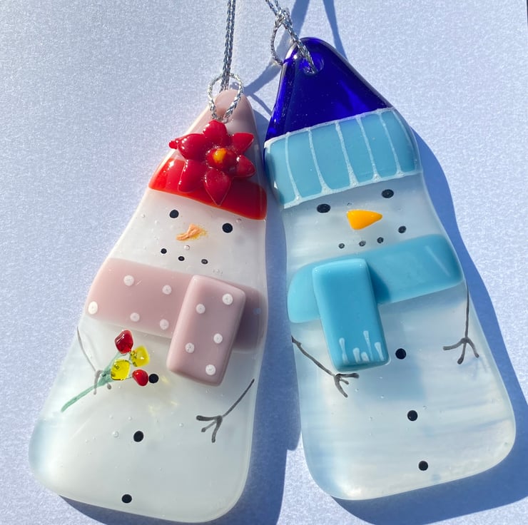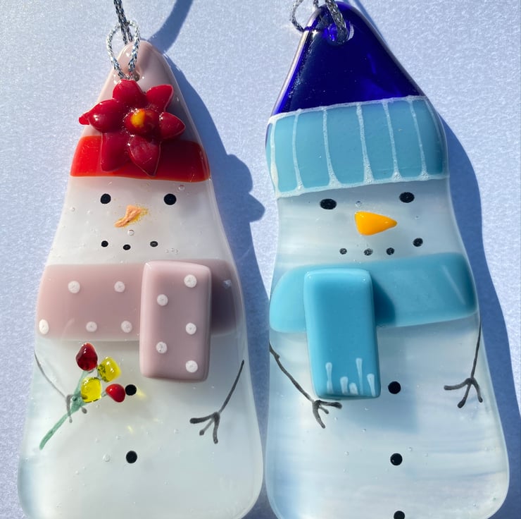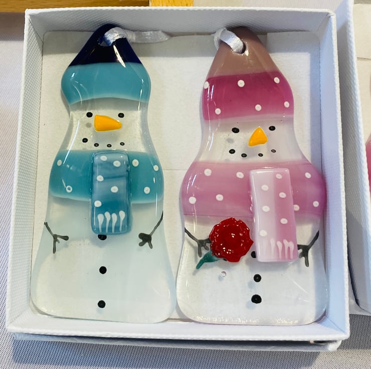 Gorgeous whispy white fused glass mr and mrs box gift set . Perfect Christmas gift that comes well packaged and secure. The fused glass snowman and snow lady I are fired over two firings and are super glossy . The whispy white lets the light shine through them . Looks beautiful on the tree . Comes in a white gift / presentation box . Each decoration is approximately 3 inch in height .