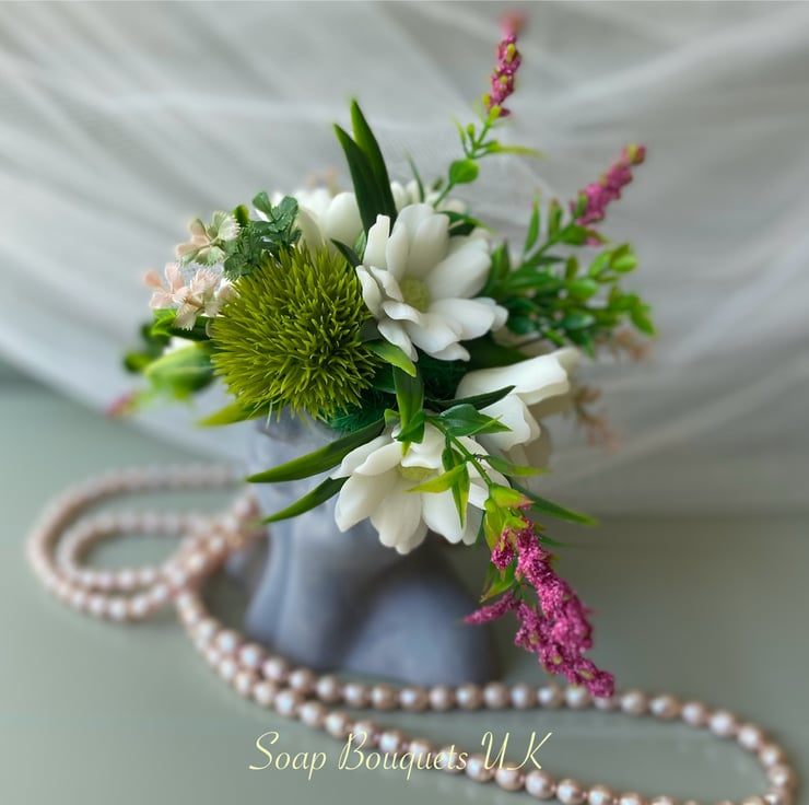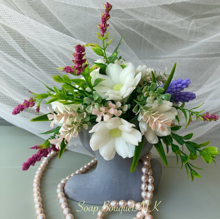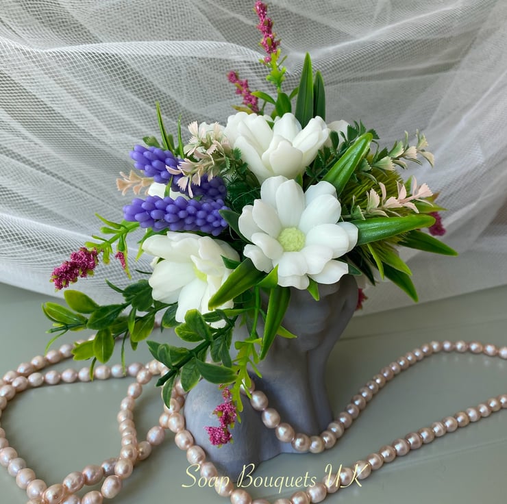 - Handmade Vegan Soap Flowers: This lovely bouquet includes white daisies and lavender flowers, all meticulously made from vegan soap.