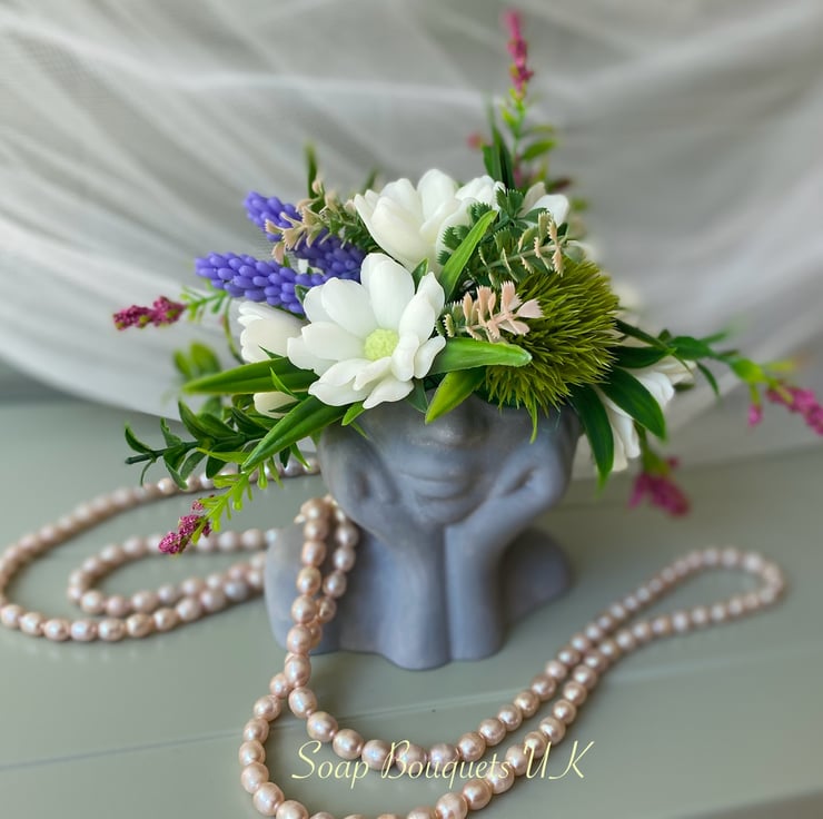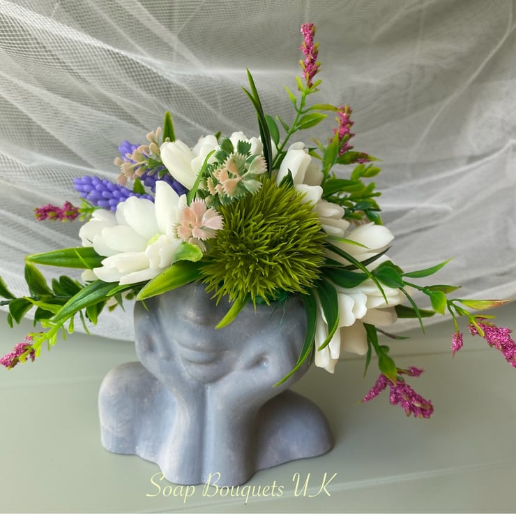 This fragrant soap flower bouquet is ideal for birthdays, thank you gifts, Mother's Day gift, unique housewarming gift, or any special occasion. Each vegan soap flower is handcrafted with care to create a unique and memorable gift. The artistic grey gypsum vase, designed to resemble a woman's bust, adds a modern flair to your decor and can be repurposed as a candle holder or jewelry stand.