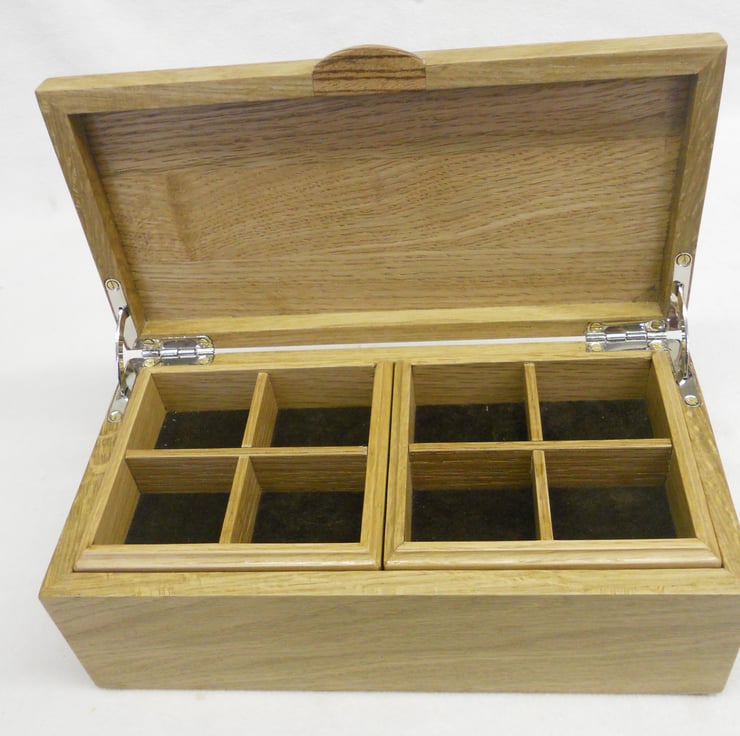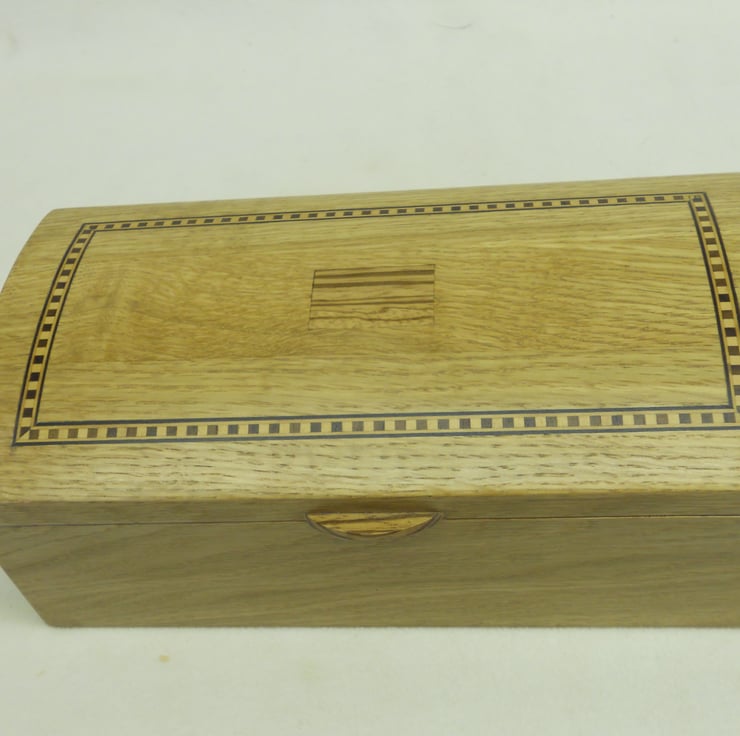 A bowed top jewellery casket handmade in solid oak, inlaid with a centre panel and lift in zebrano.