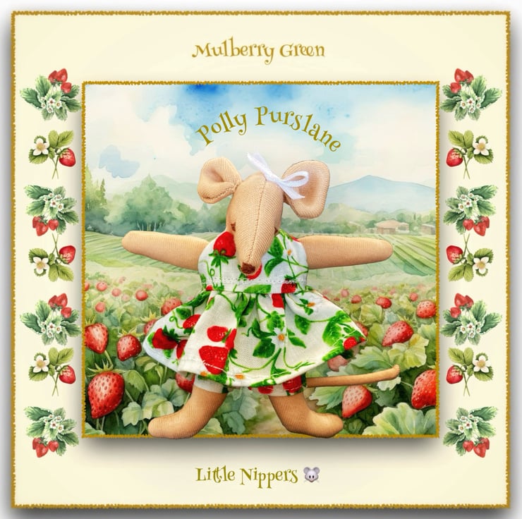 Polly Purslane, in her pretty strawberry print dress and matching pants and bow, is one of the Little Nippers - tiny mice who live in a maze of tunnels underneath the barn at Mulberry Farm. All of the Little Nippers are named after herbs or meadow flowers. The little mouse clothes are all removable and other clothes can be purchased - all of the clothes in the Little Nippers section of my shop are made specially to fit my mice. The Little Nippers are 13cm tall.