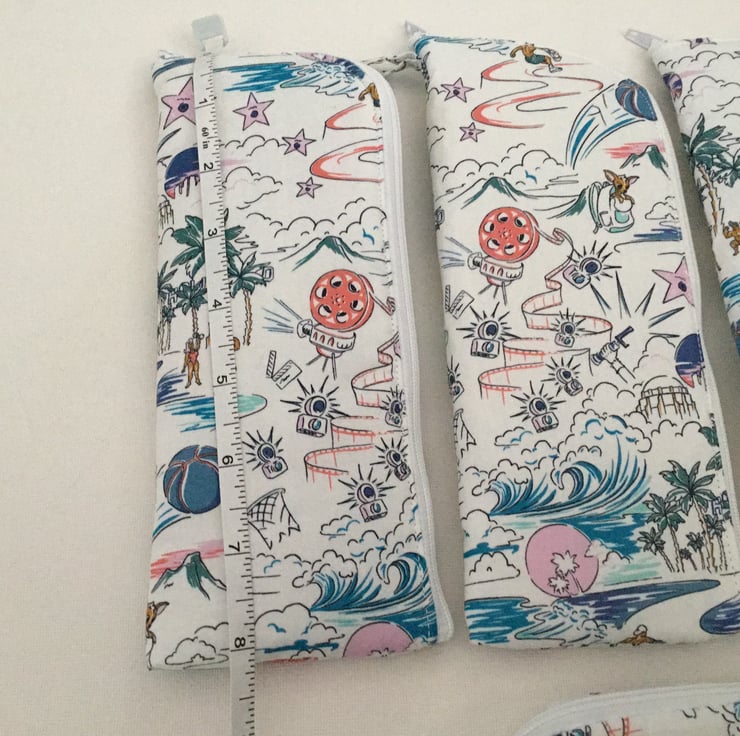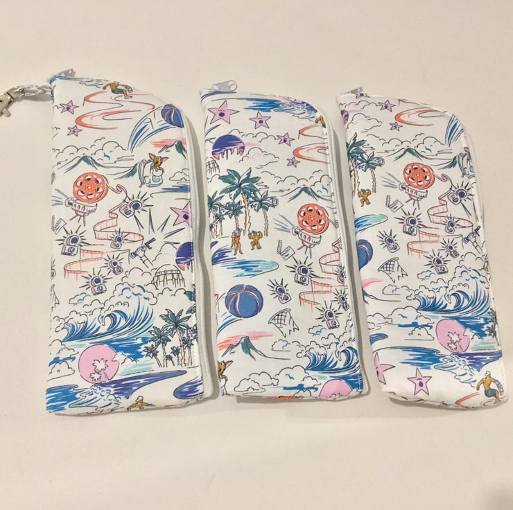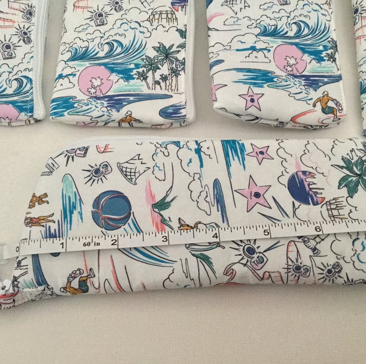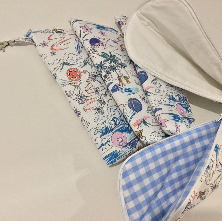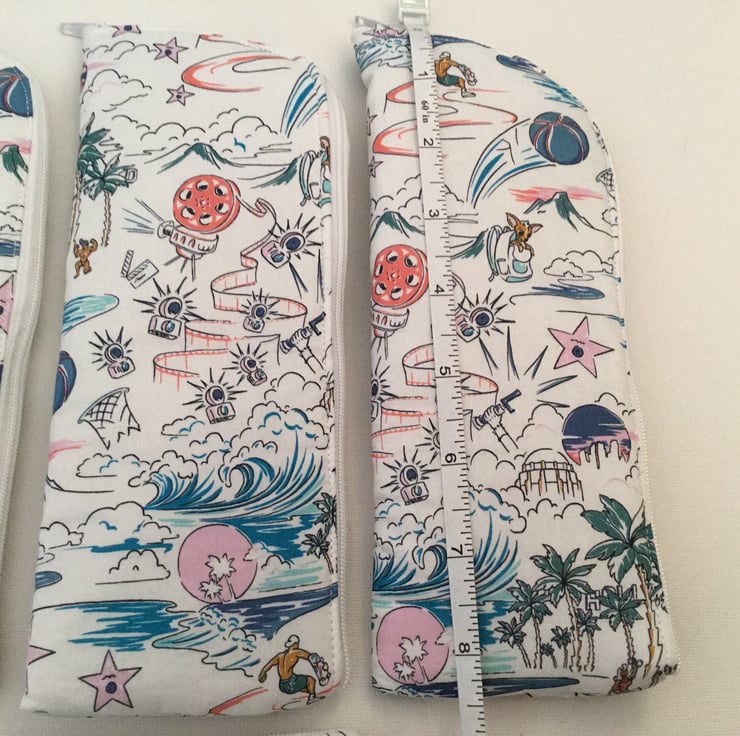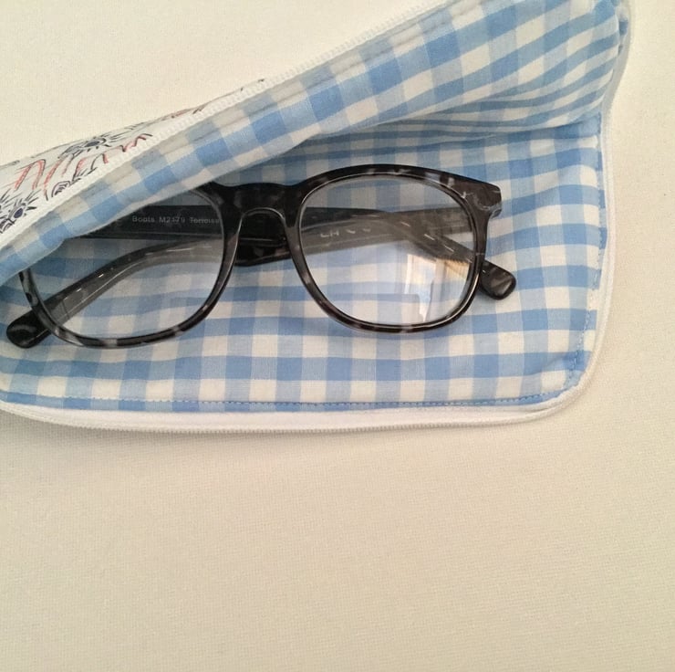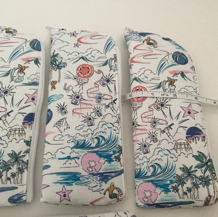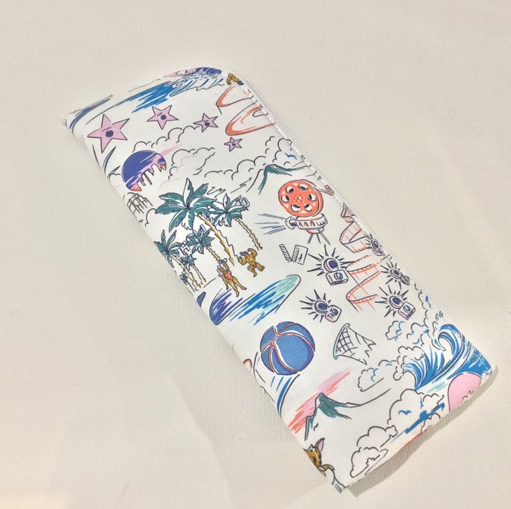 A bright fun design from Liberty London, featuring the sunny Californian lifestyle. You’ll find body builders, surfers and skaters all in beautiful pinks and blues on this silky tana lawn cotton from the coveted fabrics of Liberty. The case has a zip around closure and is lined with fusible fleece and a thin layer of wadding to help protect your glasses.