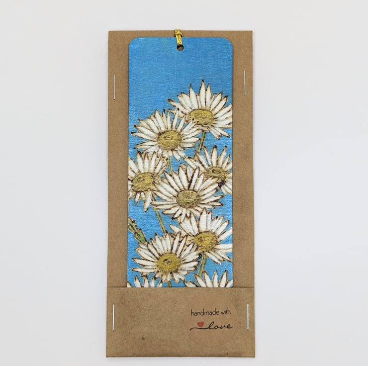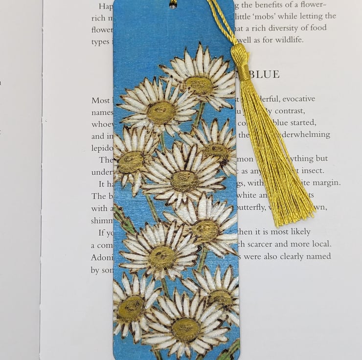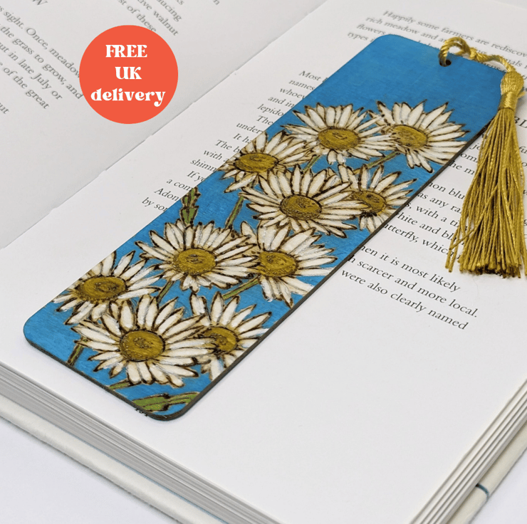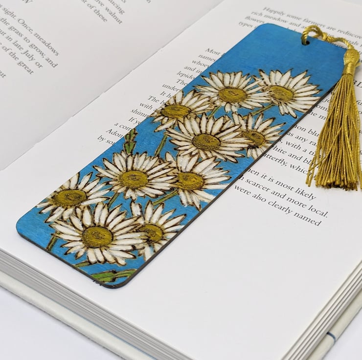 Lovely wooden bookmark featuring bright and cheerful daisies which has been handburnt, using the art of pyrography, and coloured using acrylics. A pretty way to save the page this floral bookmark has been varnished and finished with a co-ordinating tassel.