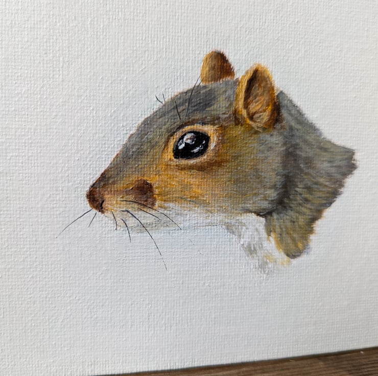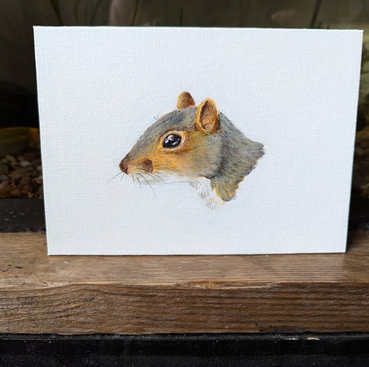 A 7" x 5" acrylic portrait of a Grey Squirrel on a flat canvas board (The painting has a slight off white/mint colour, but looks white in most lighting).