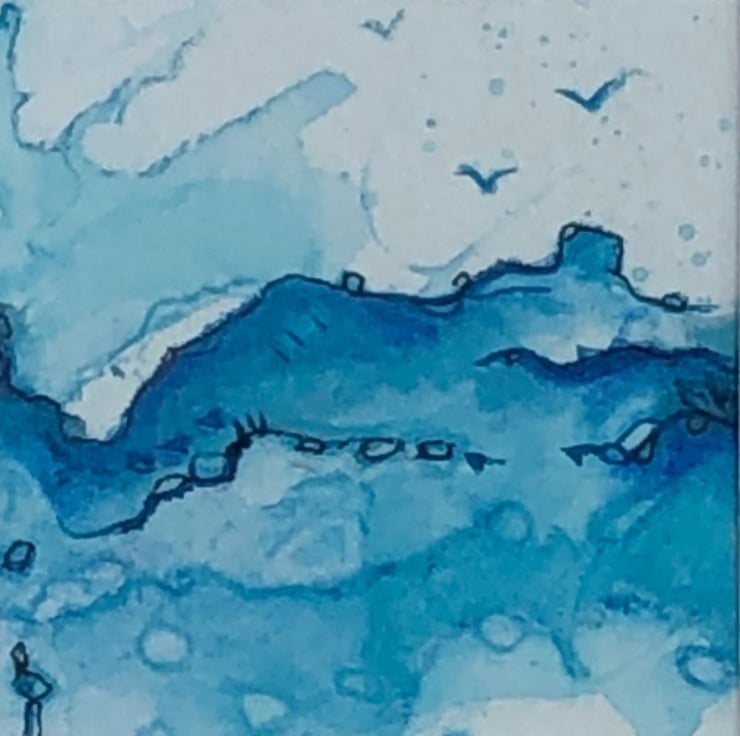 This small original art is hand painted with acrylic ink and pigments. Tiny details have been added with drawing ink and a glass dip pen. The art is inspired by the weather at the beach when the waves and the winds are high and the gulls are playing overhead.