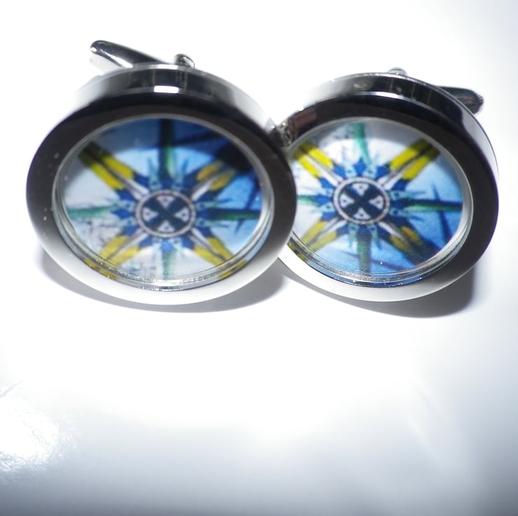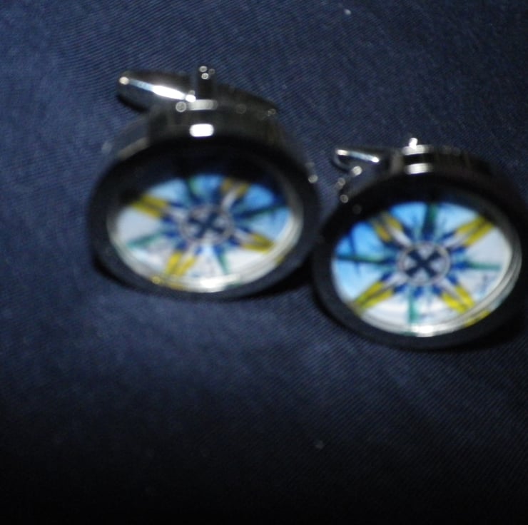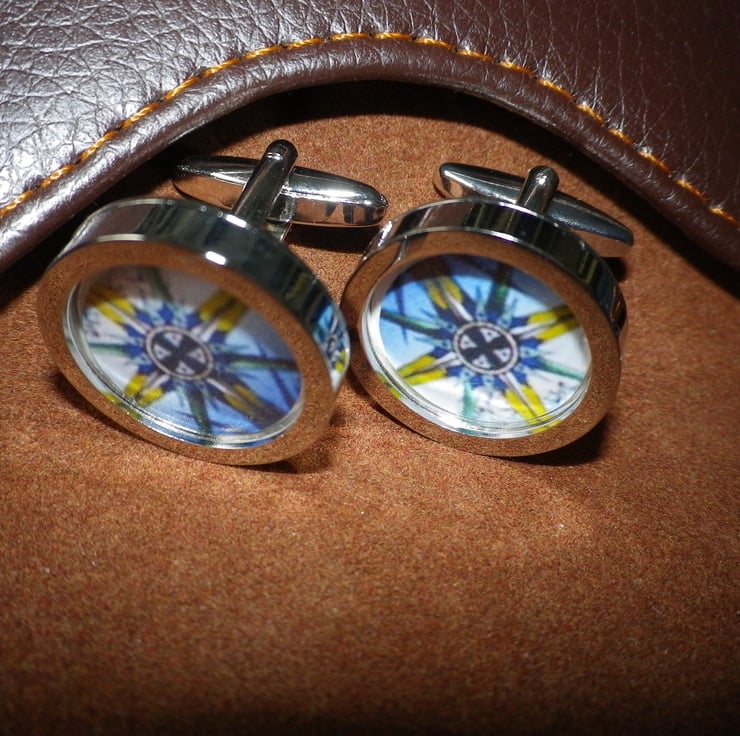 This listing is part of a programme of cufflinks made in my design studio in southern England..... images include graphic art, movies & music, animals & birds, sport,& romance, plus a wide variety of other themes, all chosen for their vibrancy and visual impact......The cufflinks are crafted from rhodium plated alloy, are highly polished with a deep setting and cigar shaped shank for ease of use .