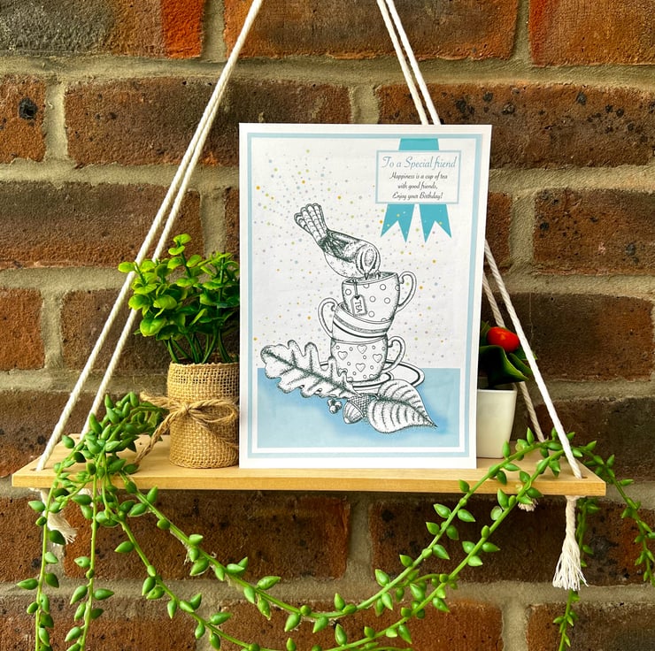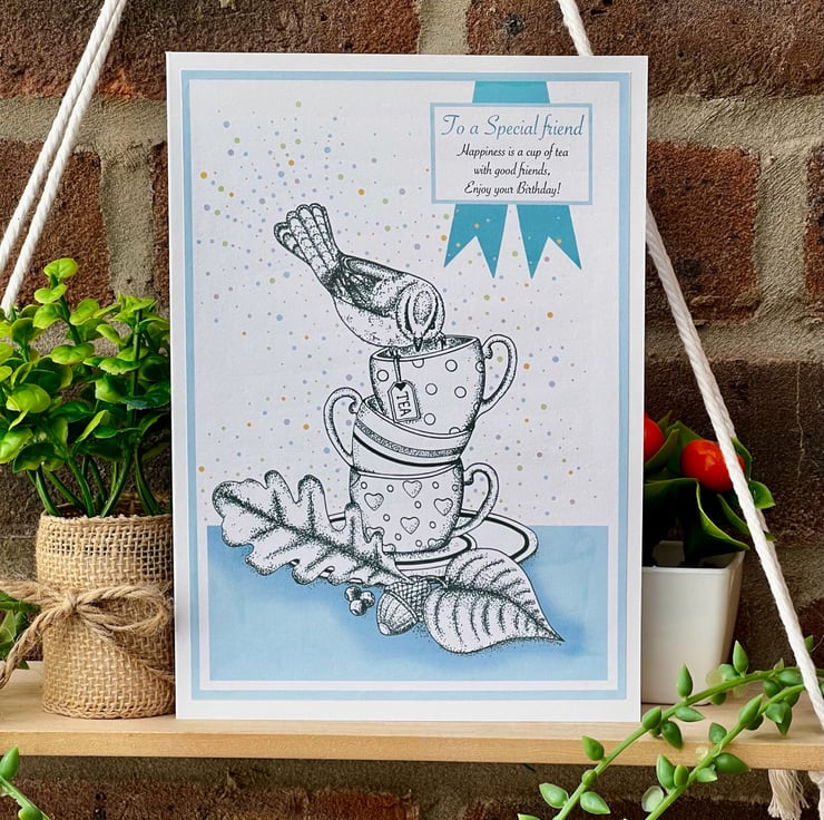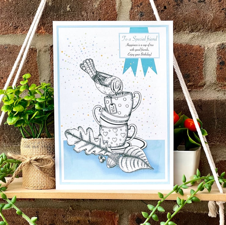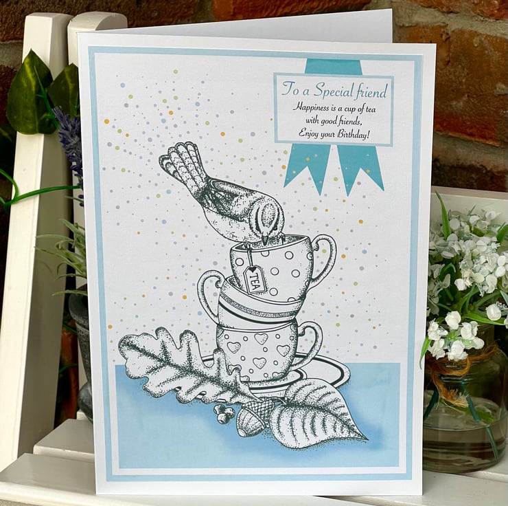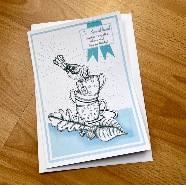 Birthday card - ‘Blue Tit tea cup stack’