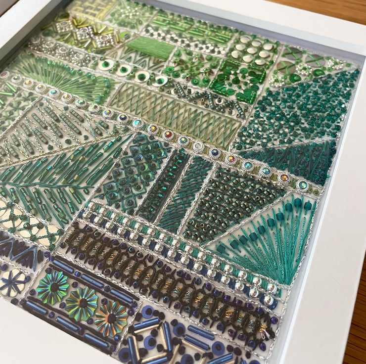 Detailed hand embroidered piece of textile art made with colourful thread, beads, trimmings and sequins - an ombre decorative pattern of Lime, Teal and Blue.