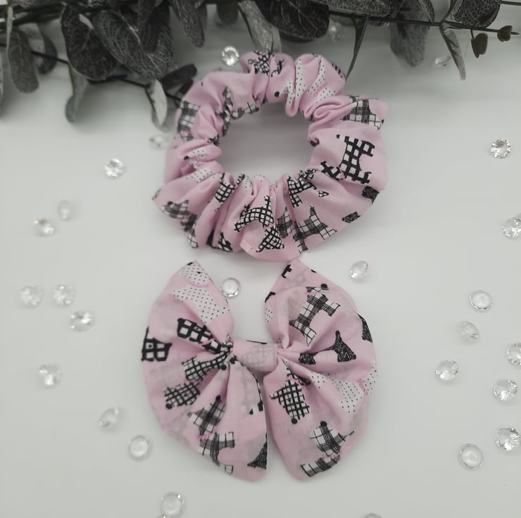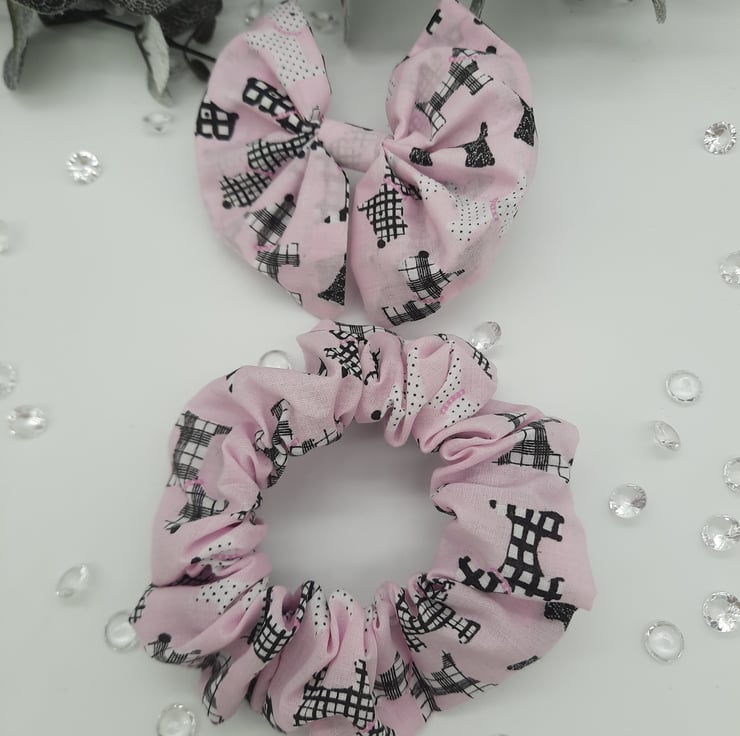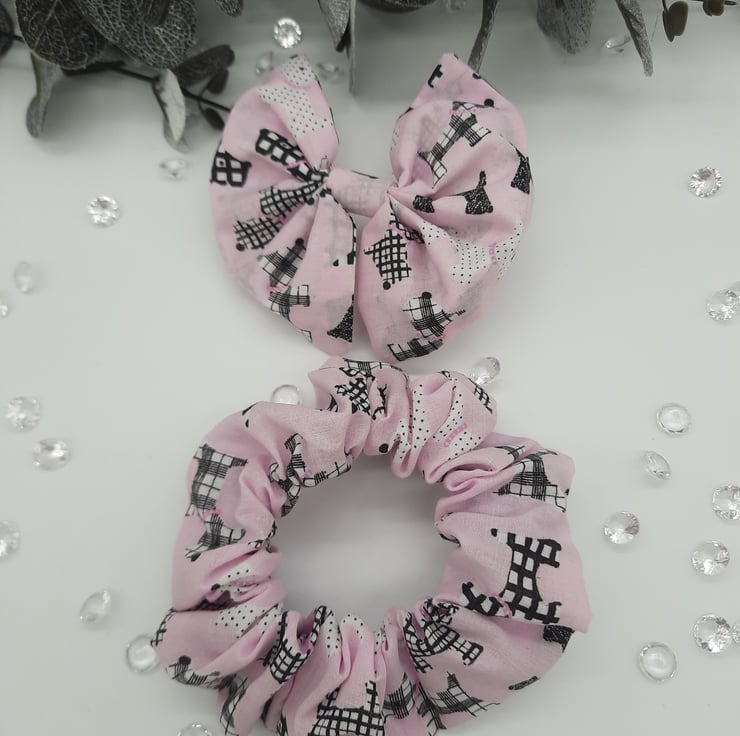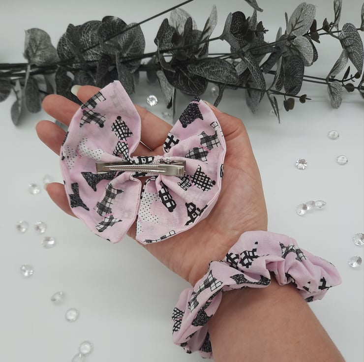 Scottie dog, pink clip on bow and scrunchie hair set.