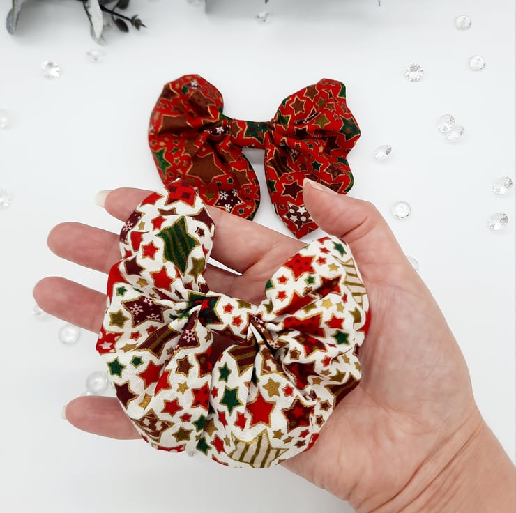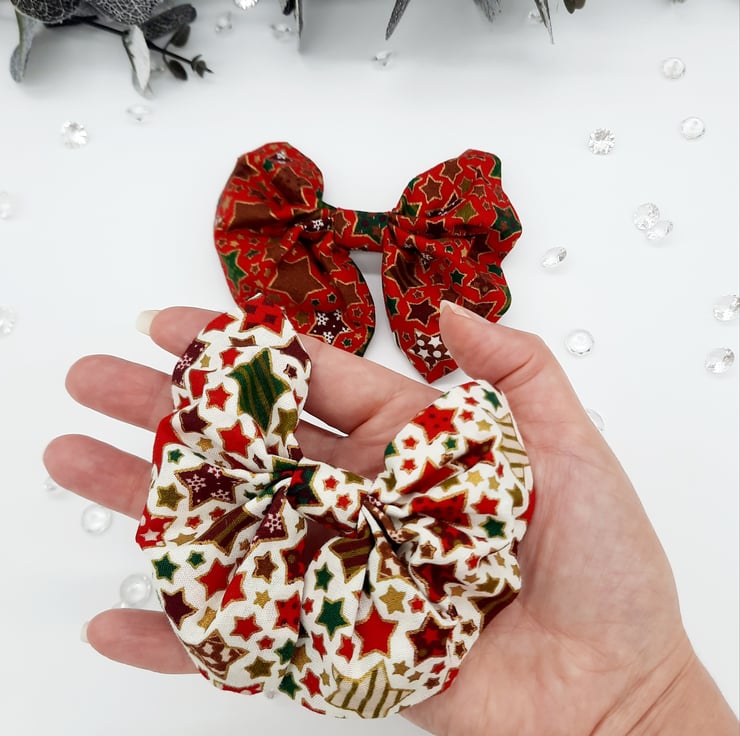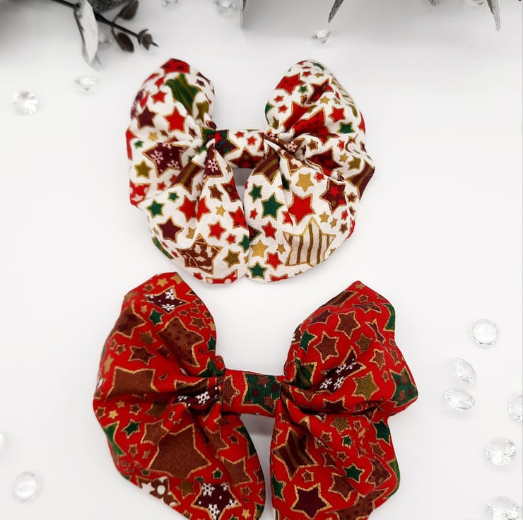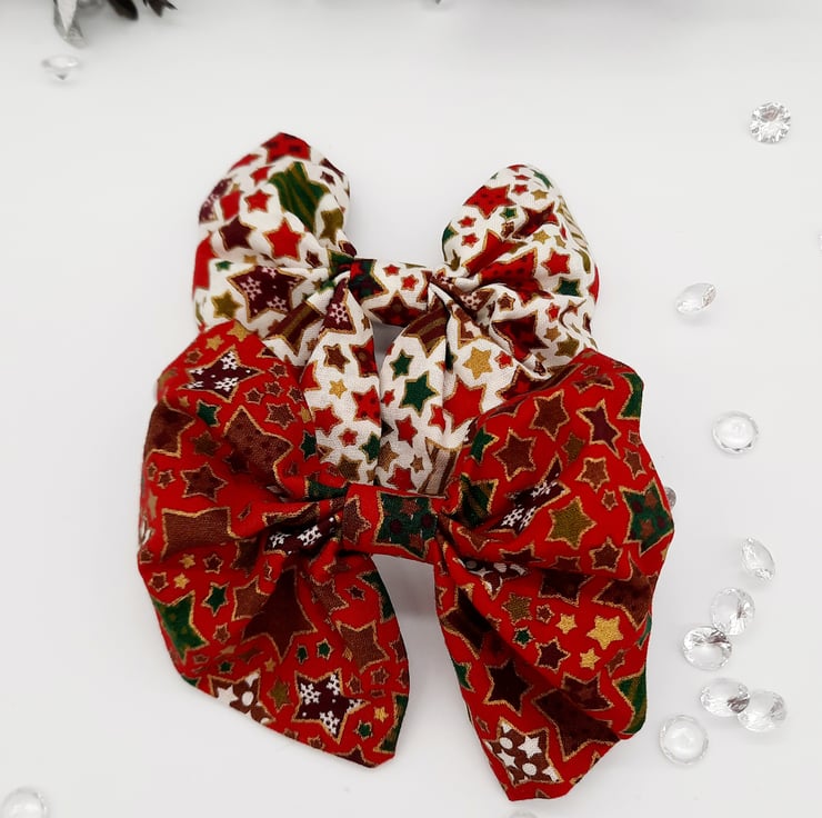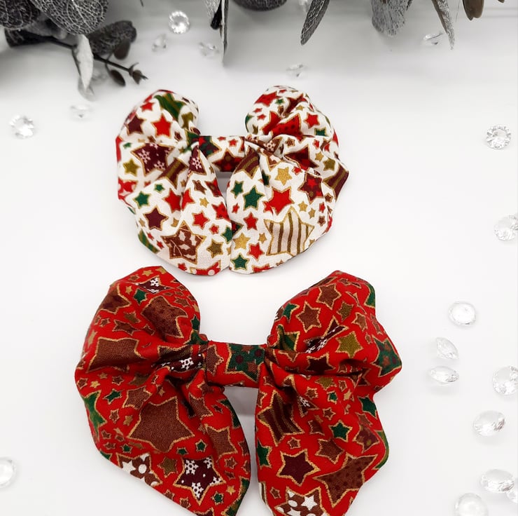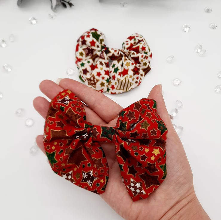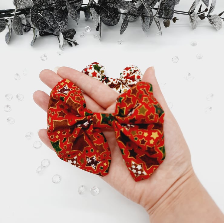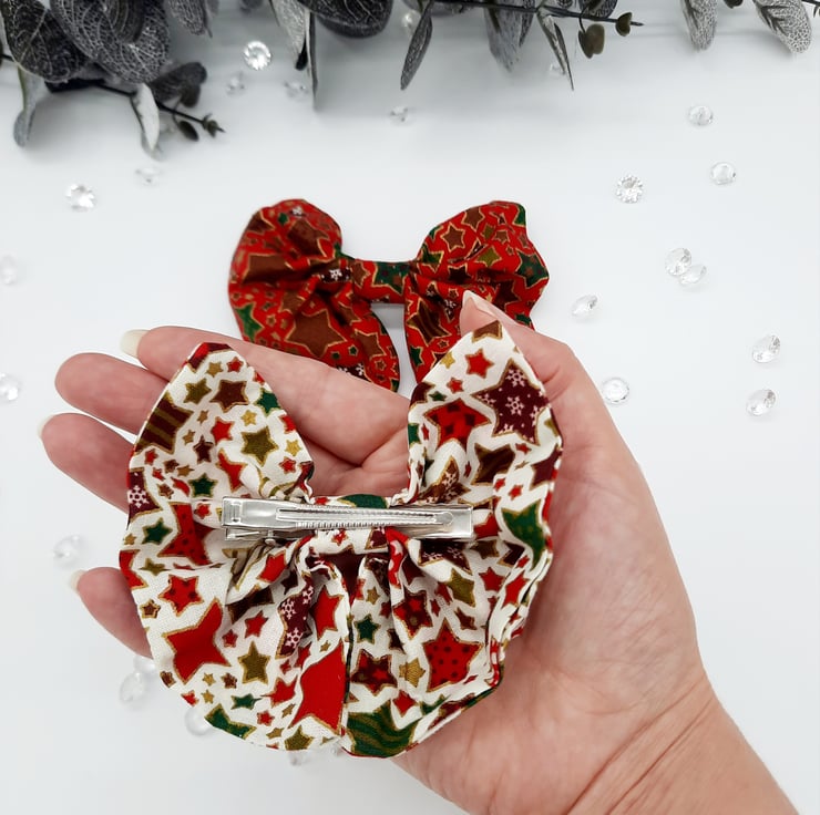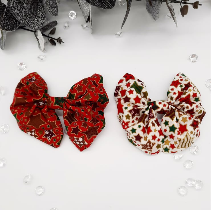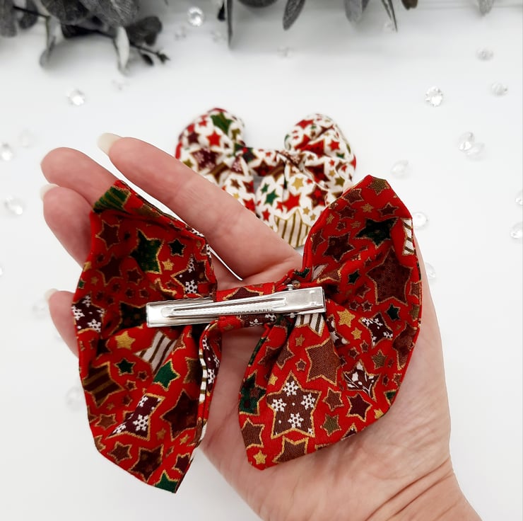 Christmas clip on hair bow set, made using red and cream star cotton fabric. Each star is out lined in gold.