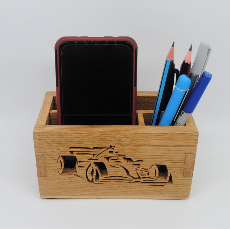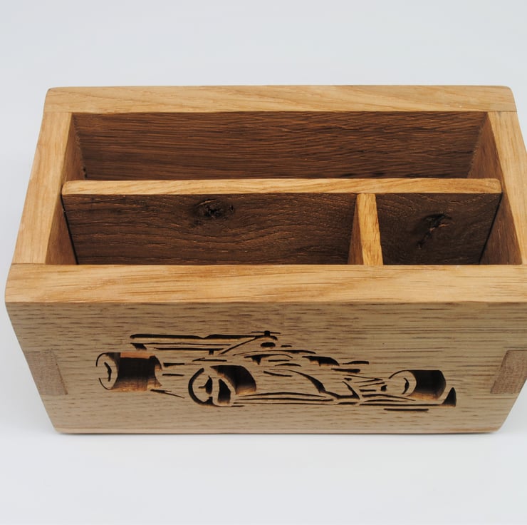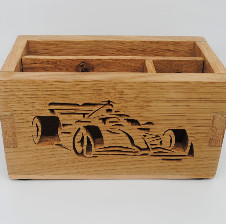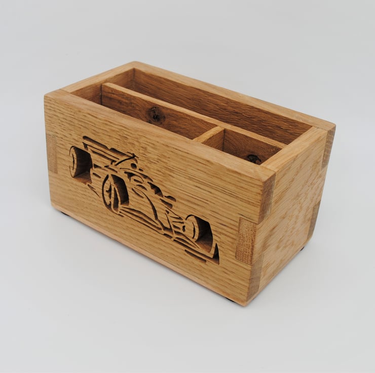 This desk tidy is handmade from solid Oak. The Formula 1 car design and box joints have been cut with a scroll saw. The box is divided into 3 sections for a range of storage purposes to suit a range of needs.