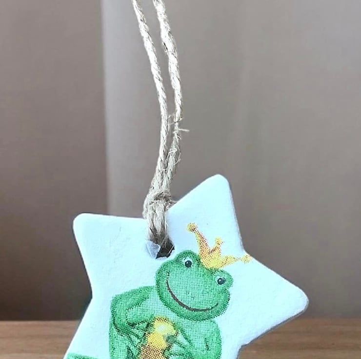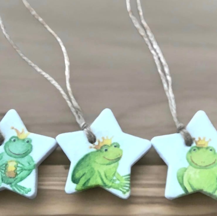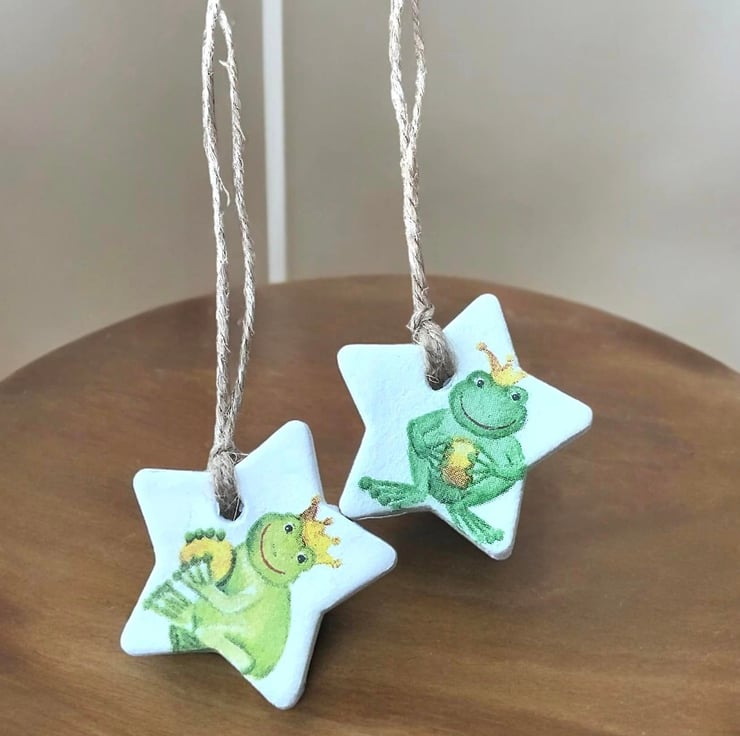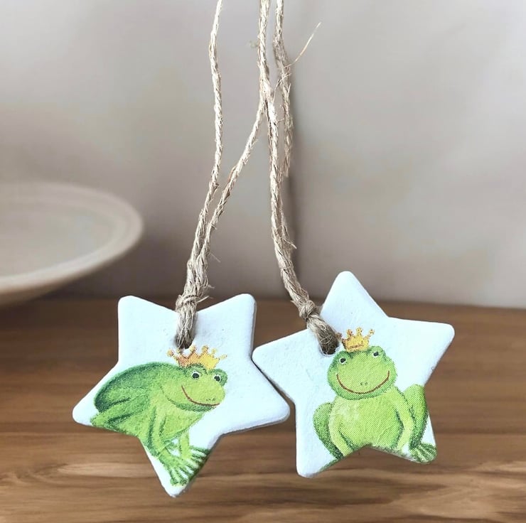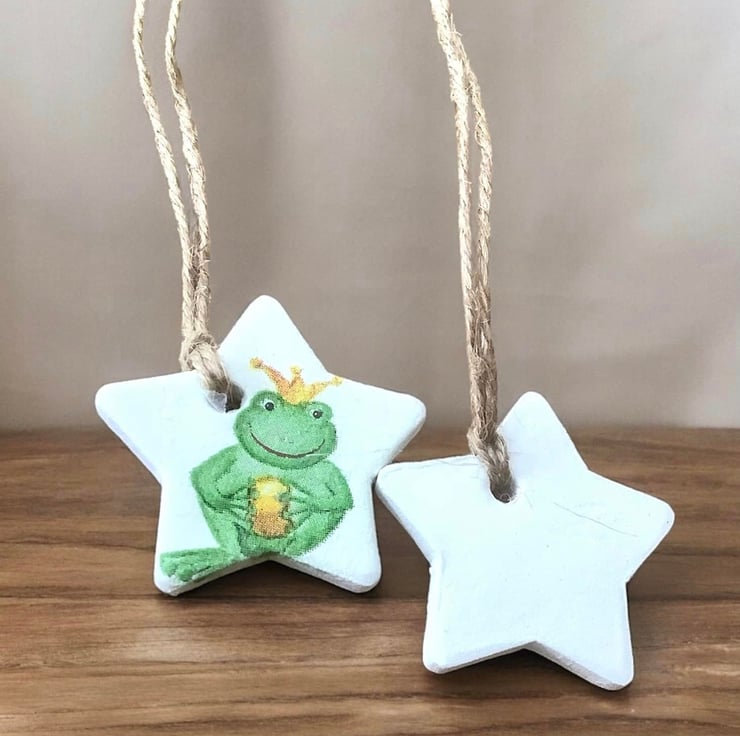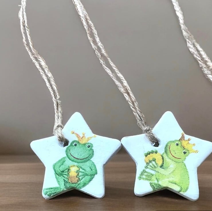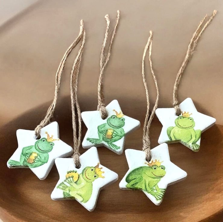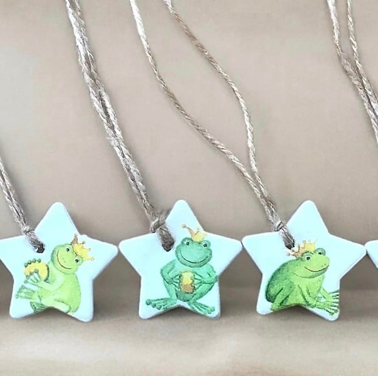 The stars have been handmade using air dry clay, sealed and the image of the frogs applied using the art of Decoupage. The reverse of the stars are left blank. Jute twine is added making these tags ready to use.
