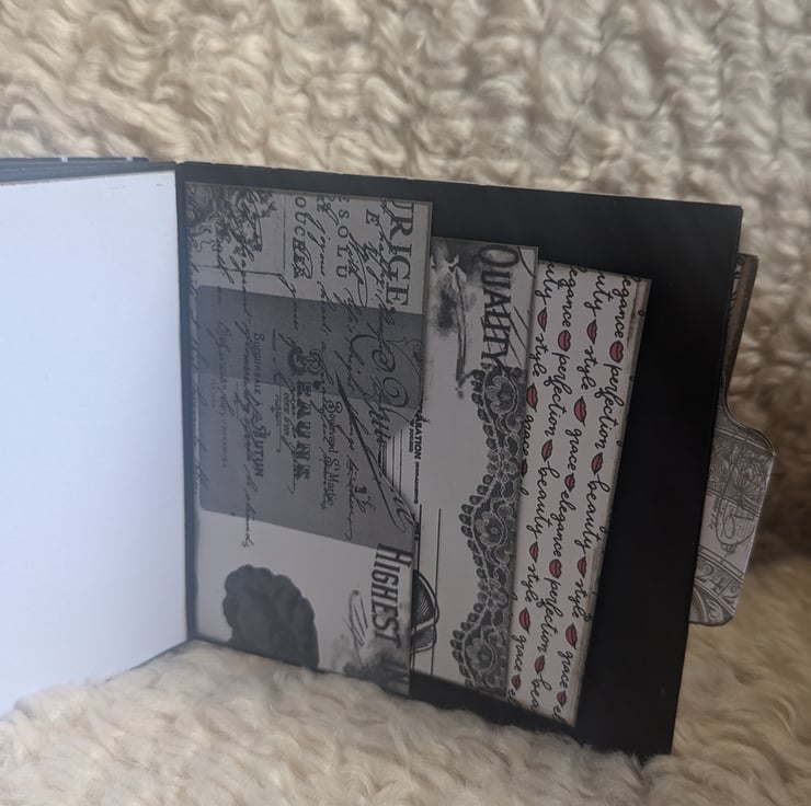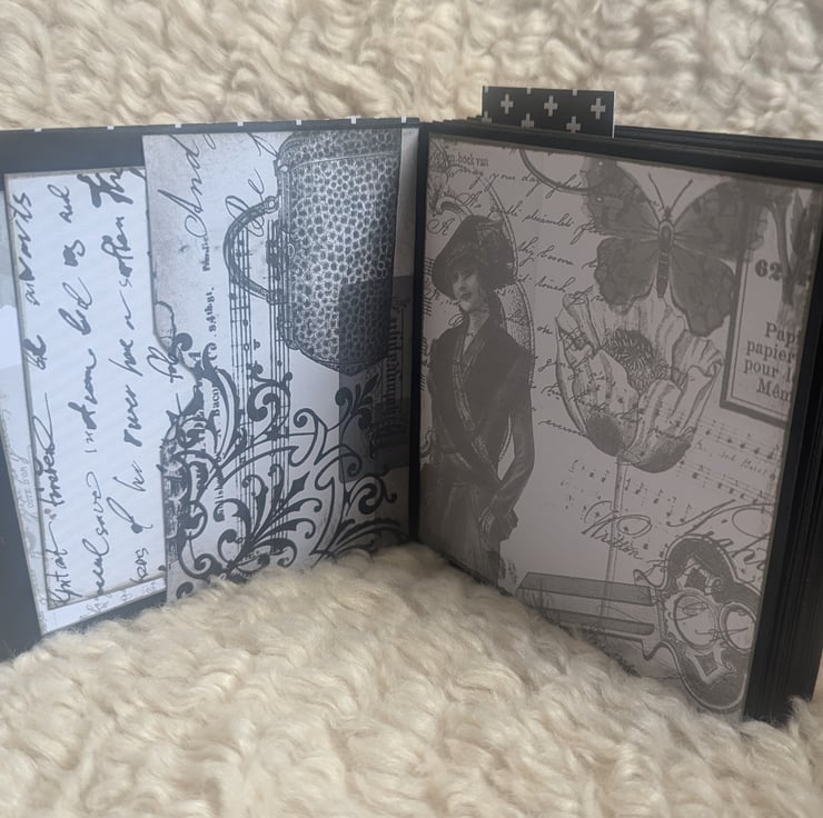 Thick black pages within covered with a mixture of white paper and opaque style grey-hue patterned paper
