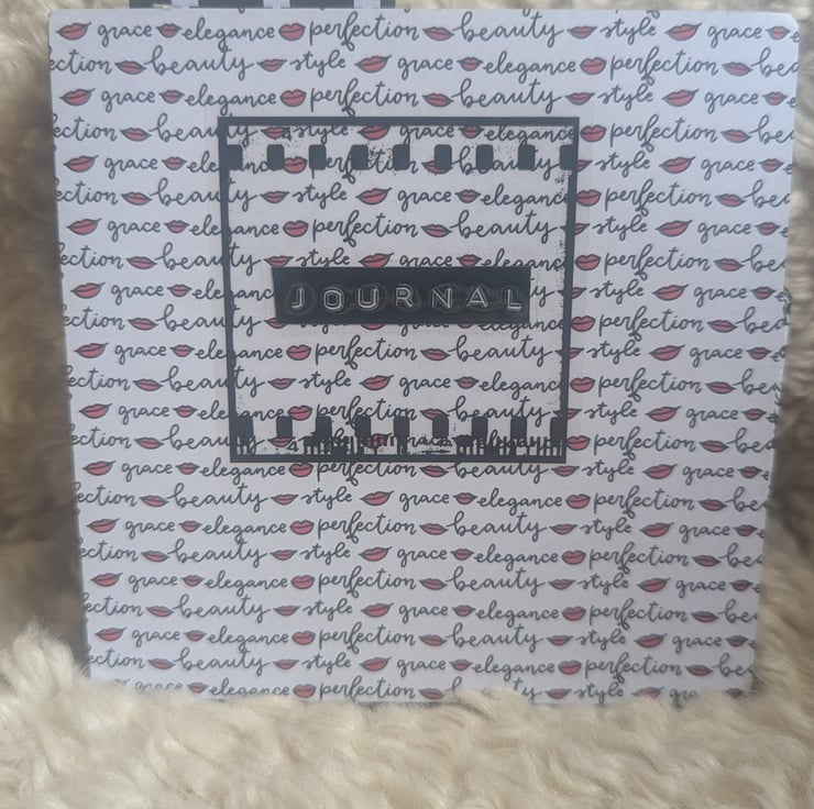 Small 4.5 x 4.5 inch, 1-inch-thick journal in red, black and white patterned ‘elegance’ paper
