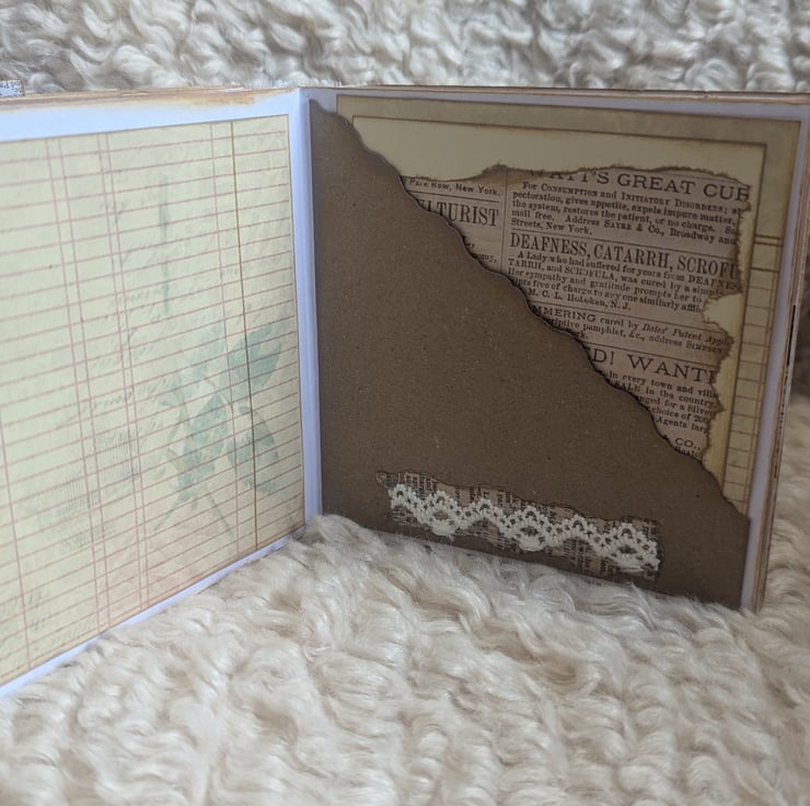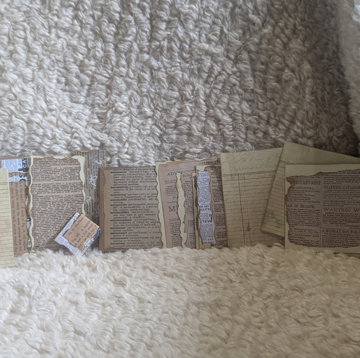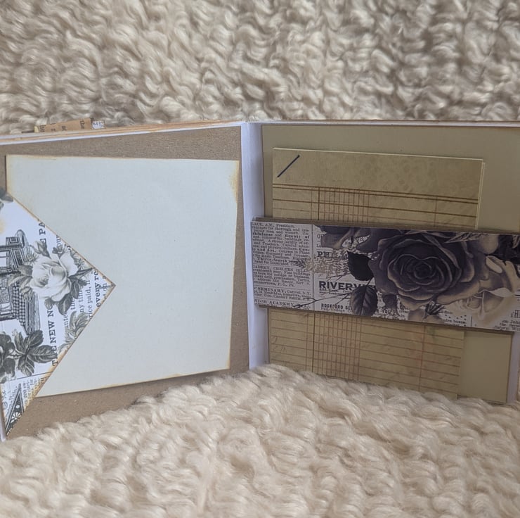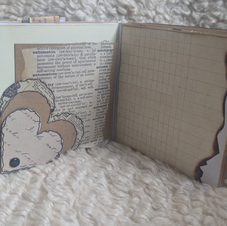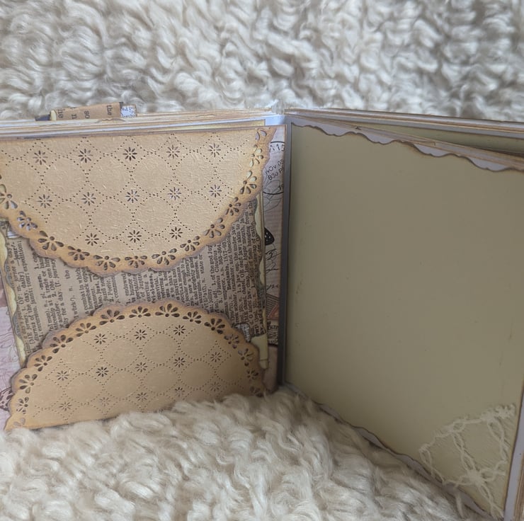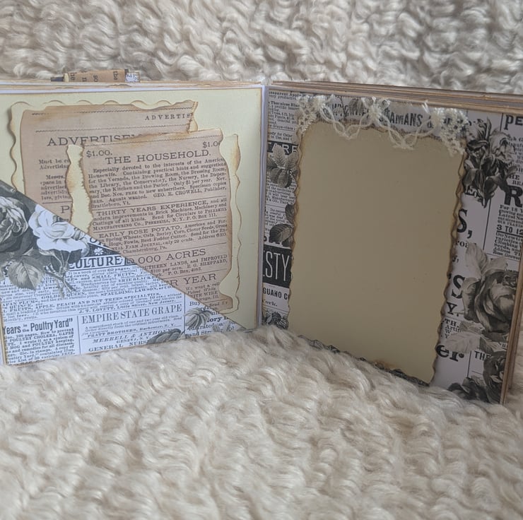 Small approx. 4.5 x 4.5 inch, 1 inch thick journal with a decorated front – cover black and white newspaper style paper, topped with a light yellow ornate flowery frame, housing ‘JOURNAL’ inside light yellow sticky gems and 4 pearl coloured liquid pearls