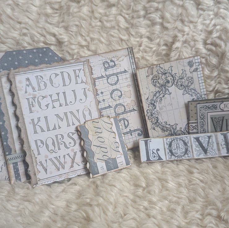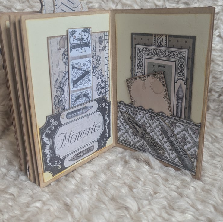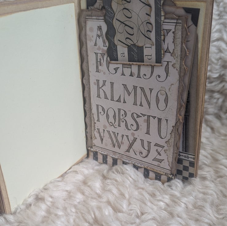 Thick kraft pages covered with thick beige-yellow paper with touches of calligraphy inspired card stock throughout