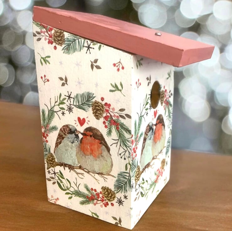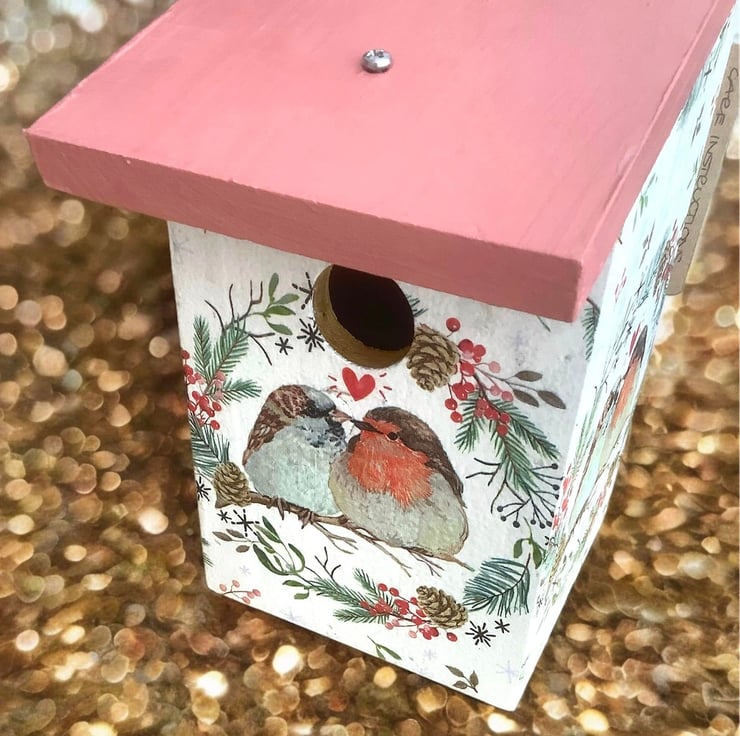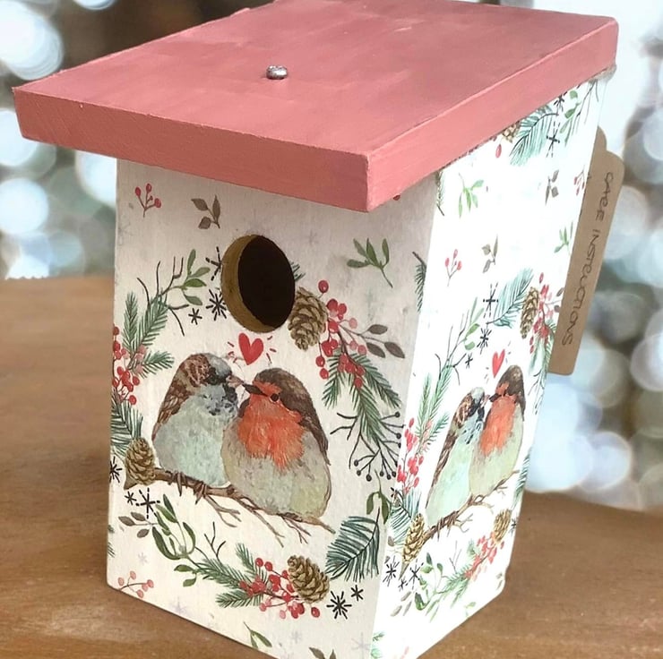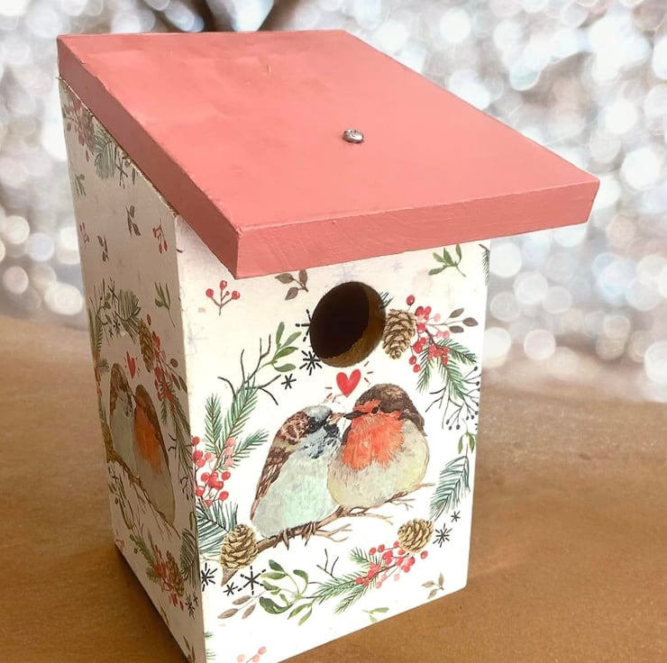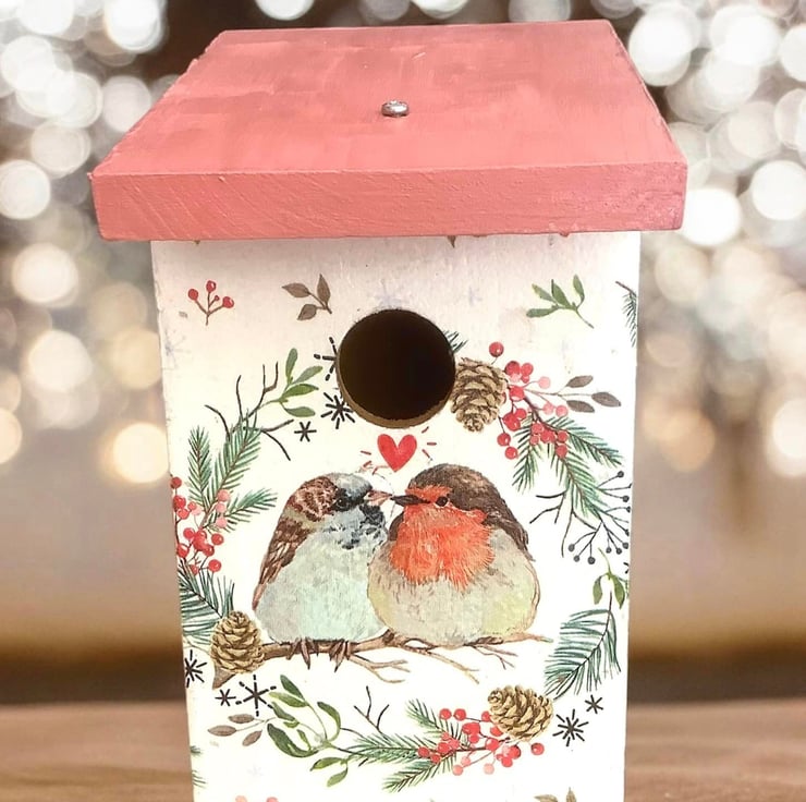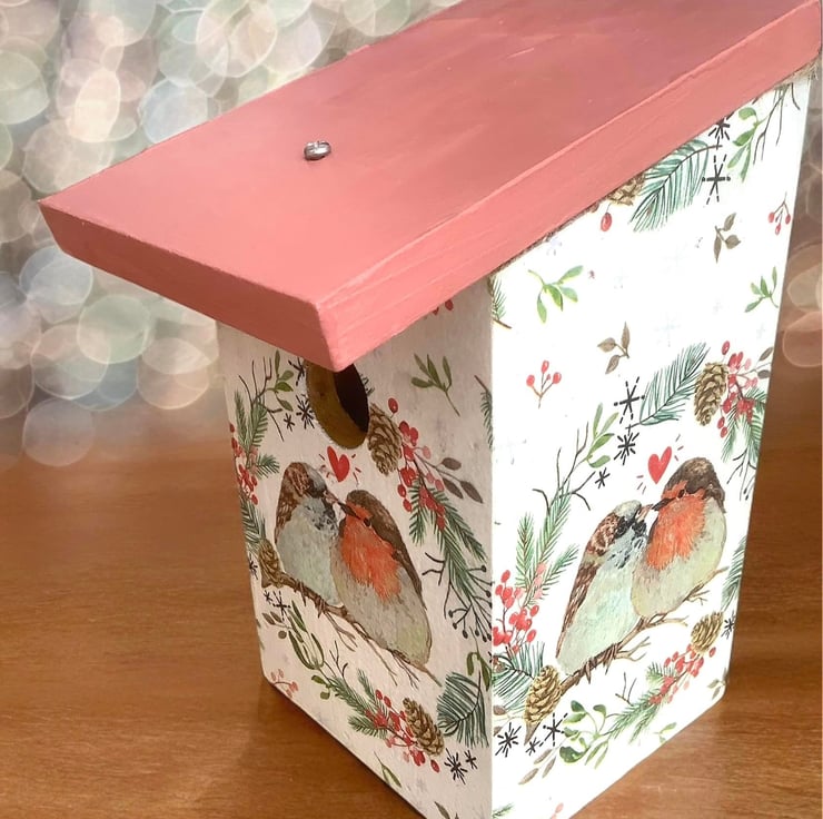 The image has been applied to an FSC sourced birdhouse after being painted with Annie Sloan chalk paint, using the art of Decoupage and finished a water resistant varnish.