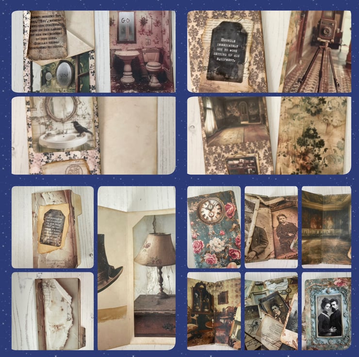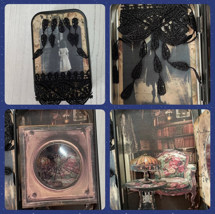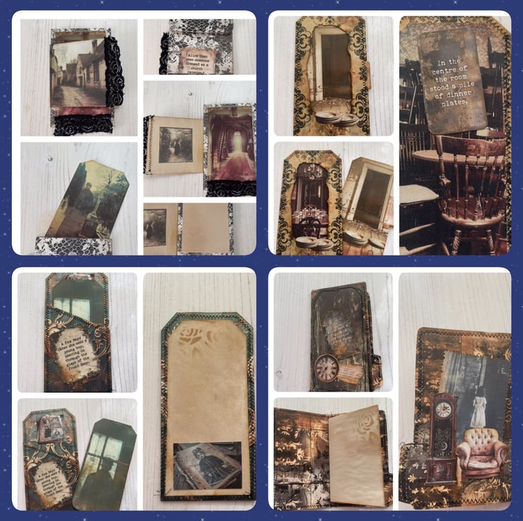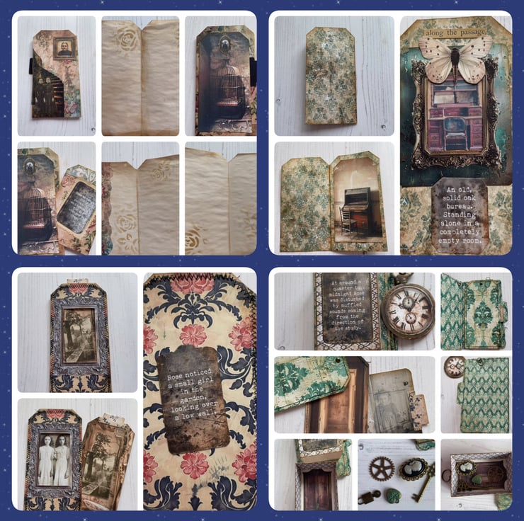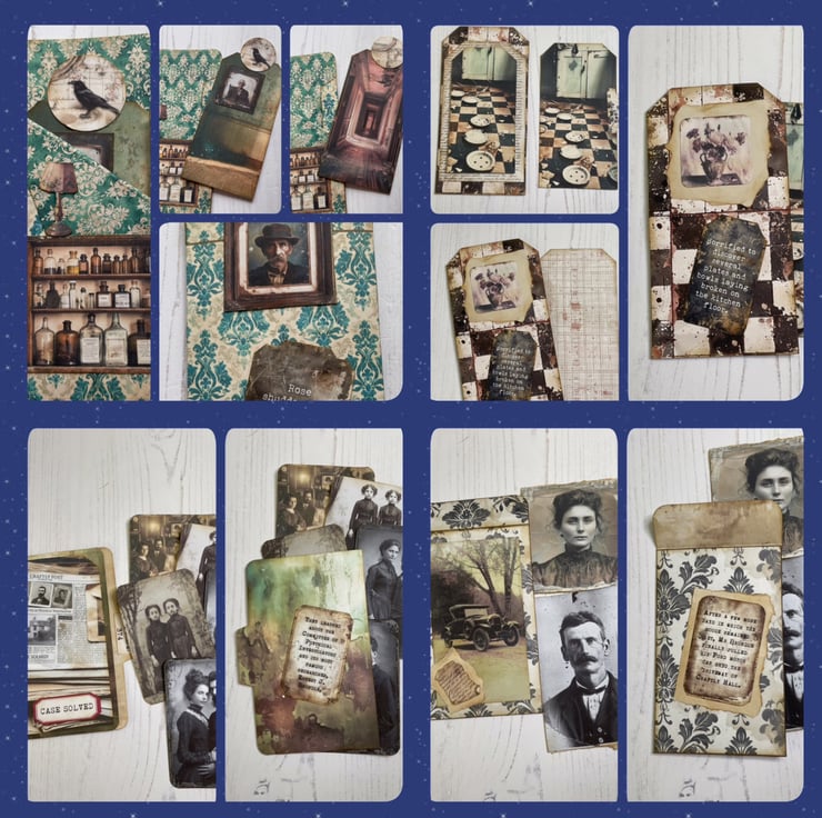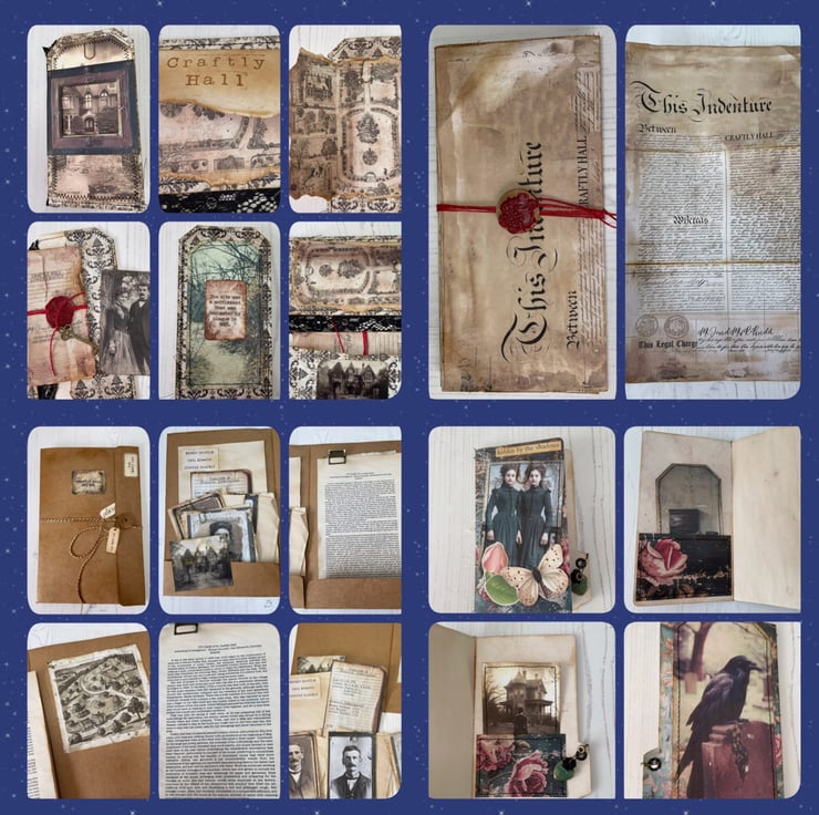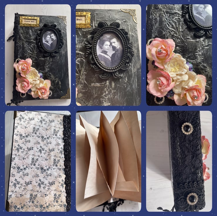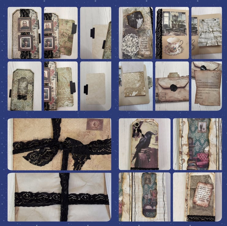 A collaboration for the month of June, has produced a Gothic journal with 30 days of ephemera projects. Some tags with pockets, mini file folders, notebooks, Victorian style gifts including a tin of treasures. Letters of a budding romance. A ghostly tale of Craftly Hall and the visiting team who hunt out clues. The journal includes the case history of the story and has been decorated with black paint, tissue paper for texture, pink roses with diamanté centres, pearls, lace, picture frame with the newly married couple who have bought Craftly Hall.Folder with details of the team involved. Photos of previous generations. A work of art every step of the way. Some of the tags have been stitched with added lace. Storage box with a pocket in the lid to hold the plethora of goodies that this creation holds.
