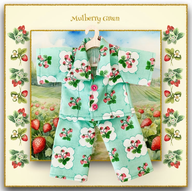 A cute little pair of turquoise and pink strawberry print pyjamas to fit the Mulberry Green characters. The pyjamas are made from cotton and are tailored like real pyjamas. They fasten with poppers under two little buttons.
