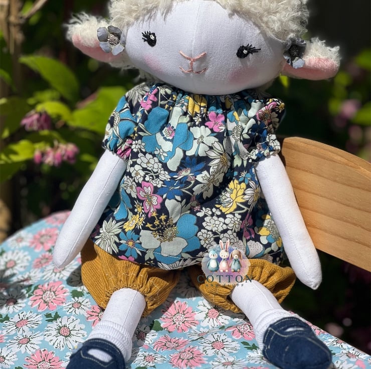 Tilly lamb just wants to be loved. How pretty does she look in her pretty floral cotton top and corduroy bloomers. Her white socks and blue shoes complete her look. Tilly has been created using Robert Kaufman fabric and her face has been hand embroidered.