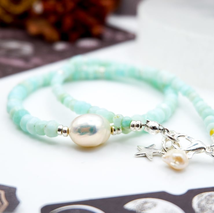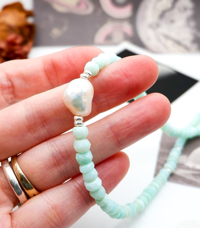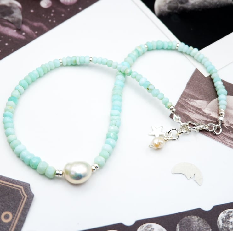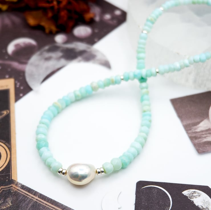Welcome to our listing for this handmade, one-of-a-kind Sky Blue Opal and freshwater baroque pearl necklace!