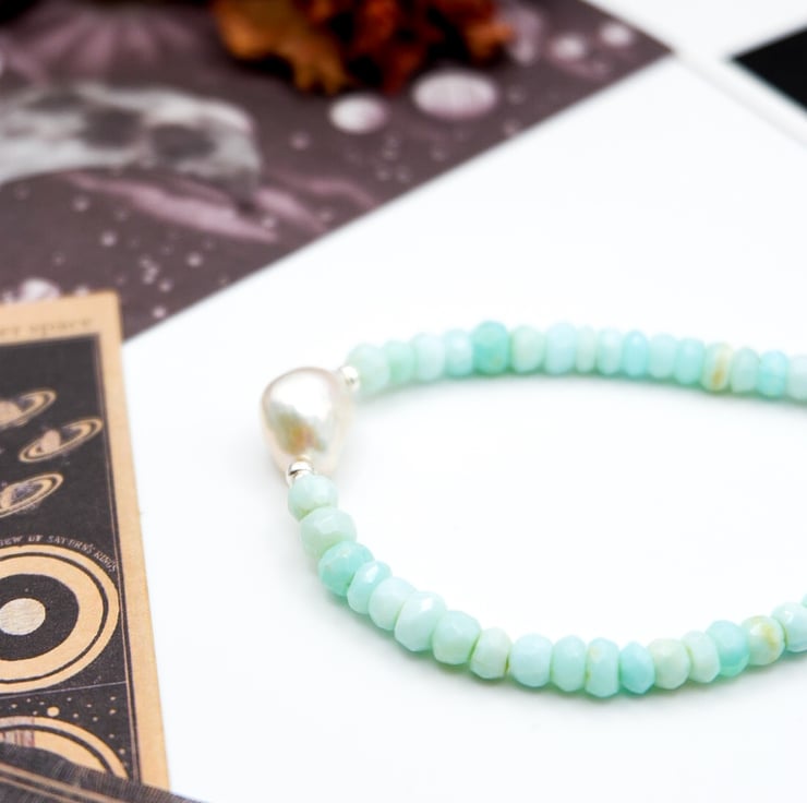 We've combined stunning Sky Blue faceted Opal gemstone beads in gently graduated rondelles, and paired them with sparkling sterling silver components, including rondelle beads. We've also added beautiful, large iridescent freshwater baroque pearl focal pendant.