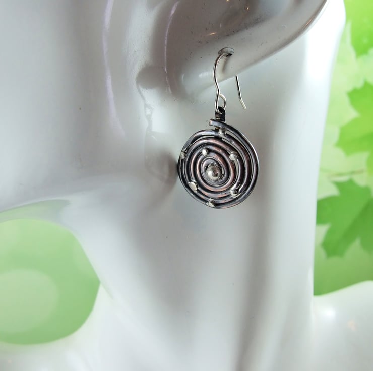 Spiral Galaxy Earrings. Sterling Silver and coiled copper wire droppers