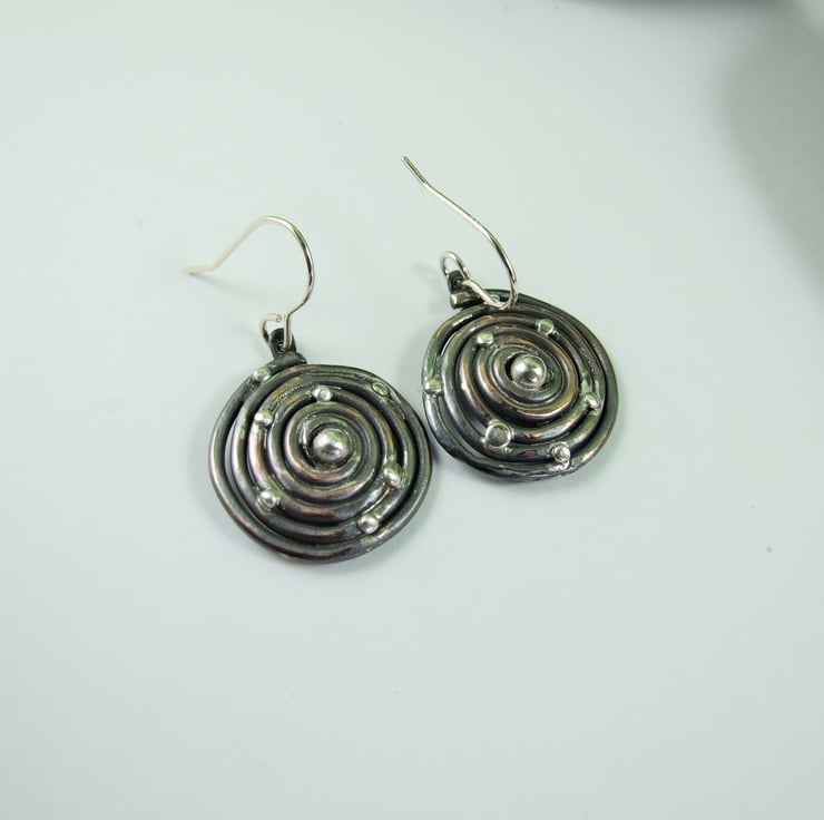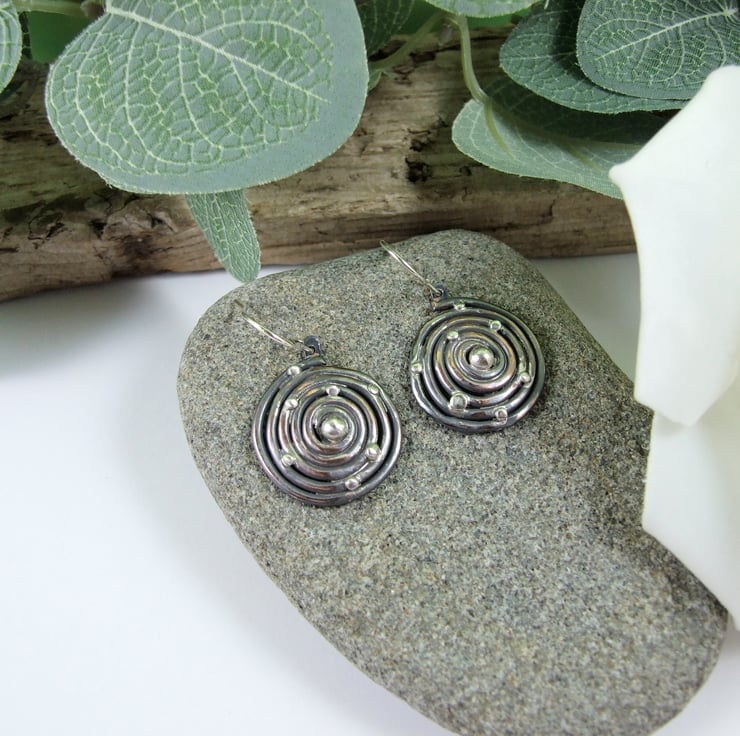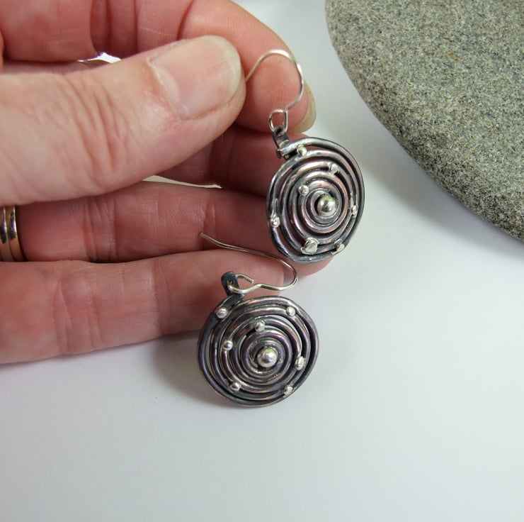 I have created the spiral by coiling copper wire by hand. The spiral is soldered from the back to keep it in shape and I have added sterling silver beads to represent heavenly bodies in a galaxy. Fitted to sterling silver ear wires and given an oxidised antique finish.