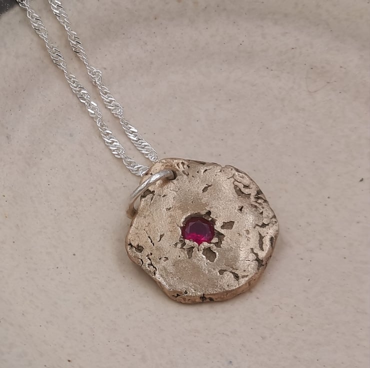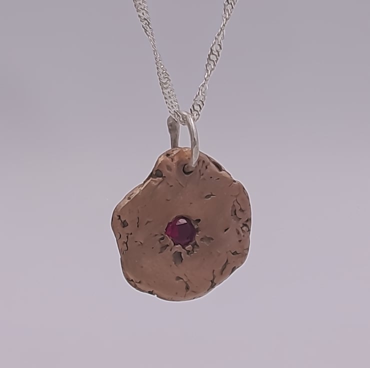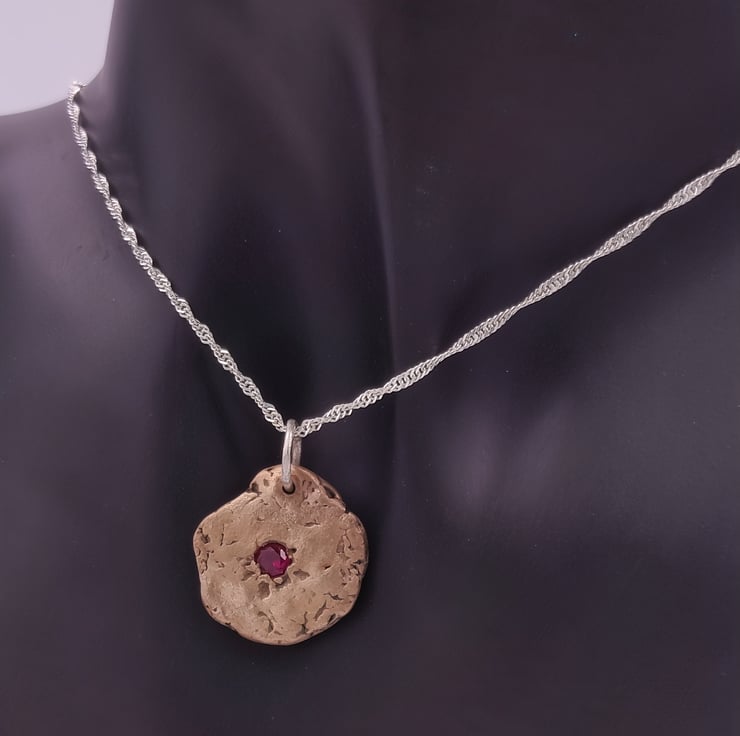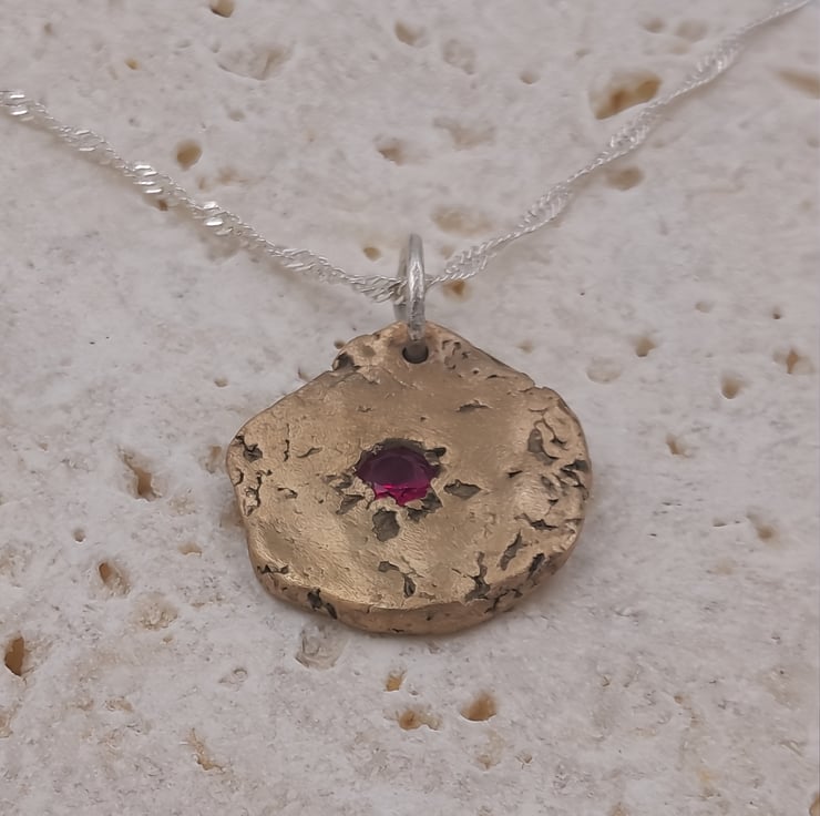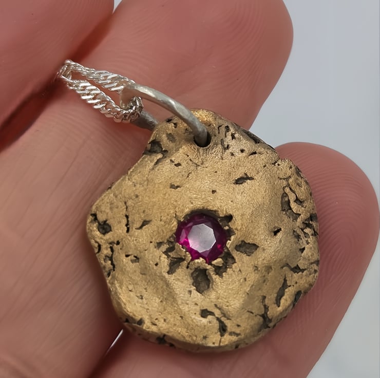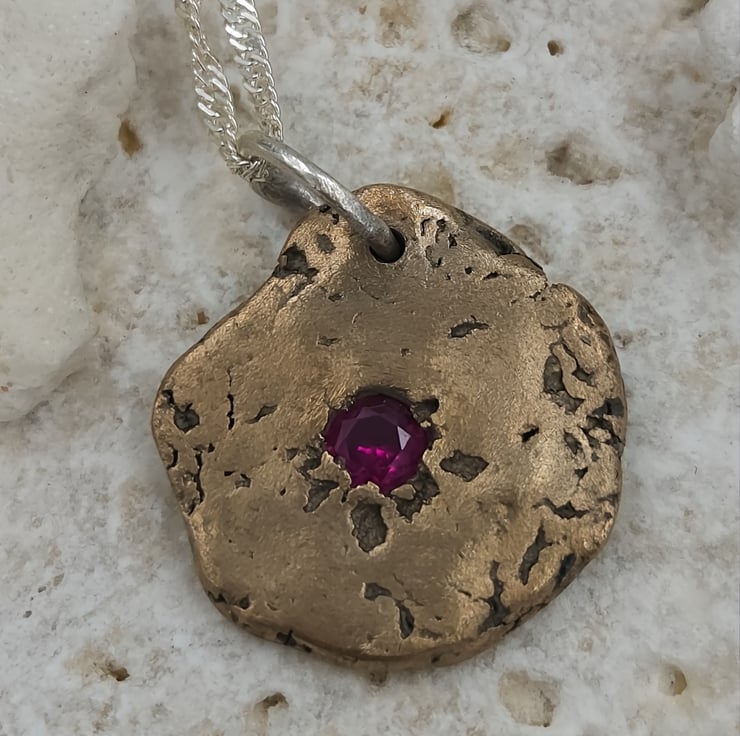 Crafted from sunny bronze metal clay, the pendant features a captivating organic, molten texture. At its heart sits a fiery synthetic ruby, adding a touch of vibrant colour and elegance to the design. The irregular shape and texture add a touch of authenticity and individuality to each piece, making it truly one-of-a-kind.