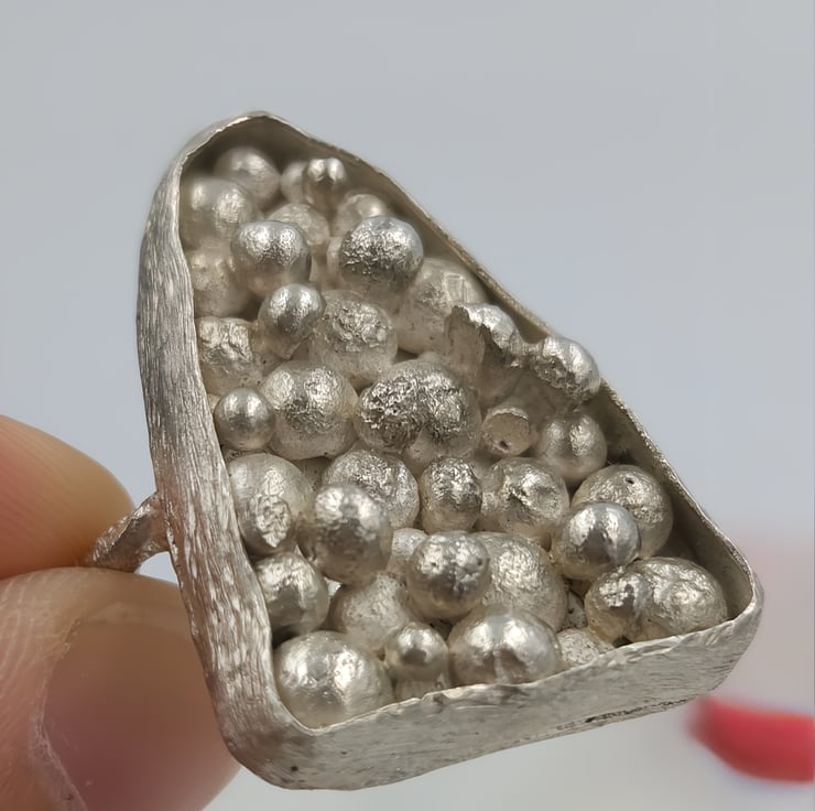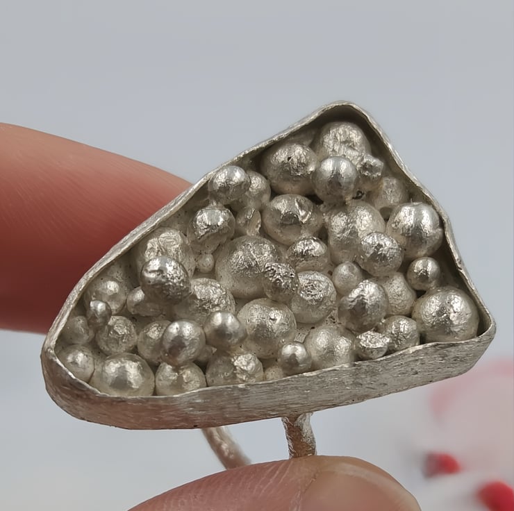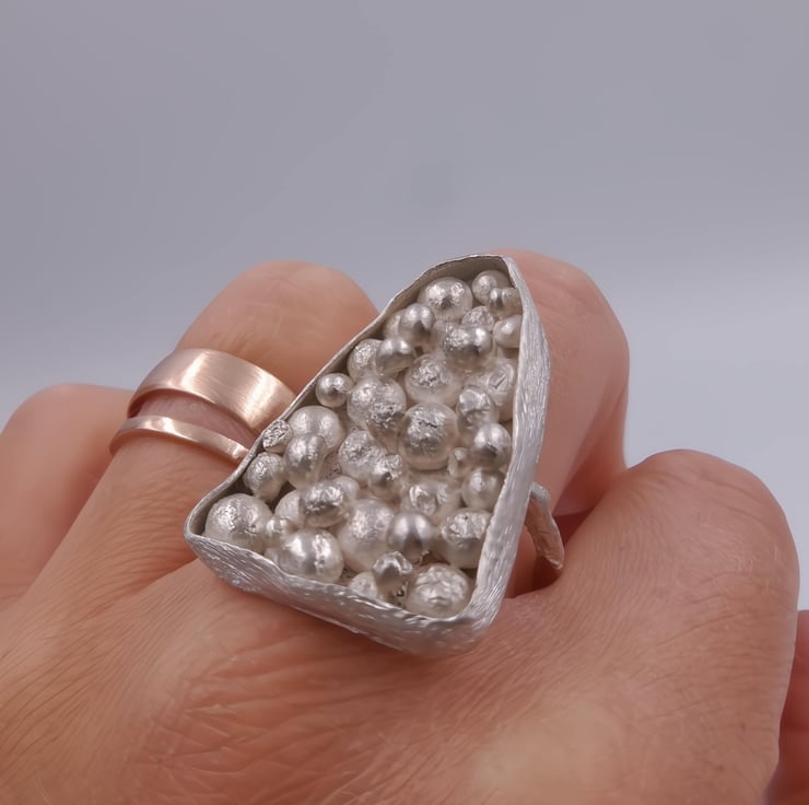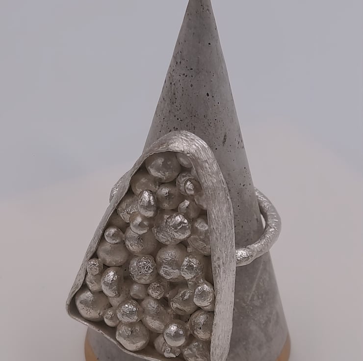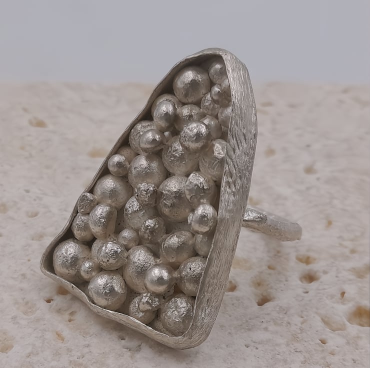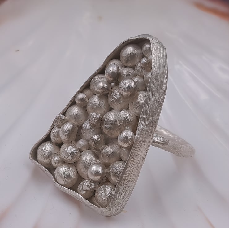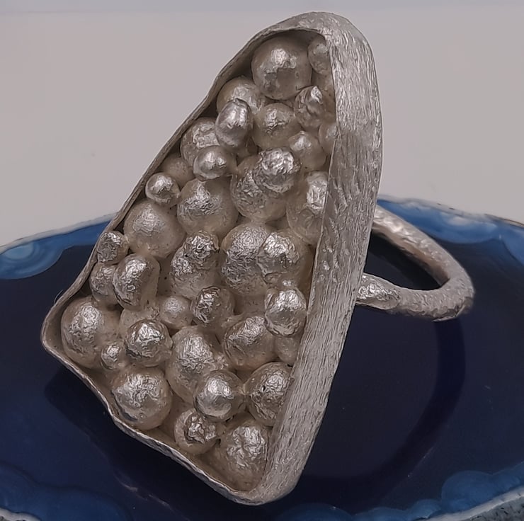 Make a bold statement with the Grand Silver Granule Bezel Ring, a striking piece that combines contemporary design with timeless elegance. This impressive ring features a multitude of meticulously crafted silver granules, artfully encased in a robust bezel setting. The high-quality sterling silver construction ensures durability and a lustrous finish that will shine for years to come. Whether you're dressing up for a special occasion or looking to add a unique touch to your everyday style, this ring is sure to turn heads and become a cherished part of your jewellery collection.