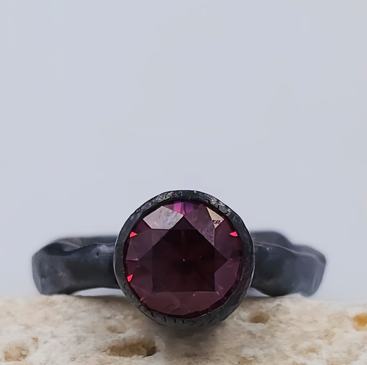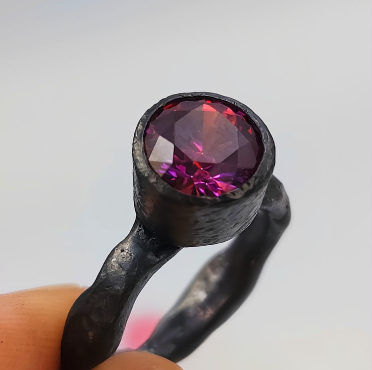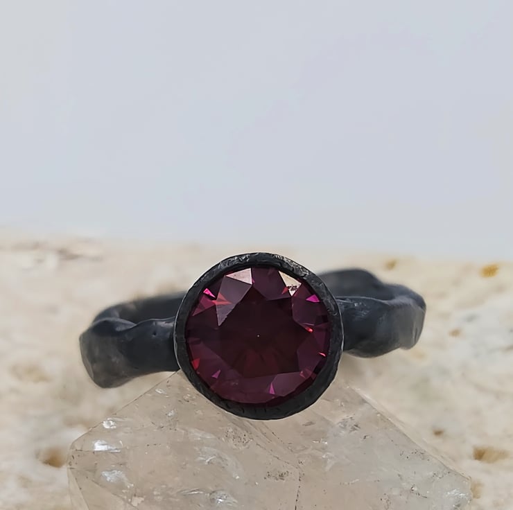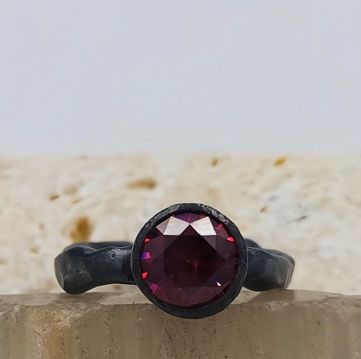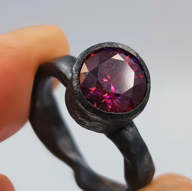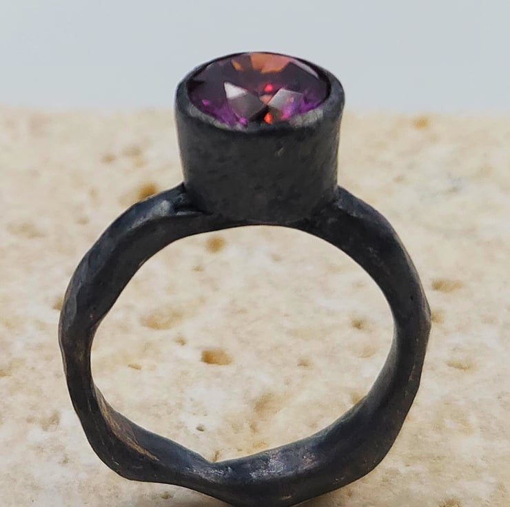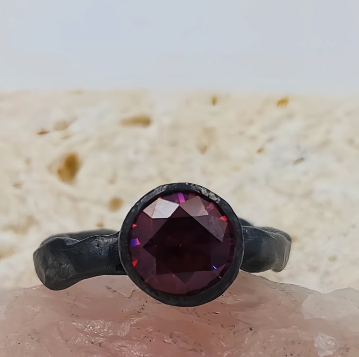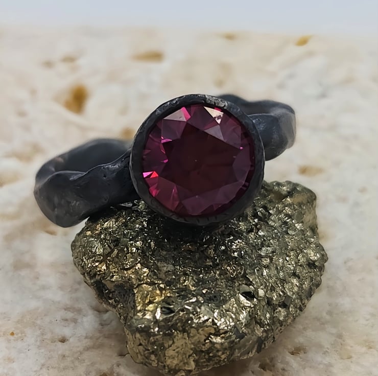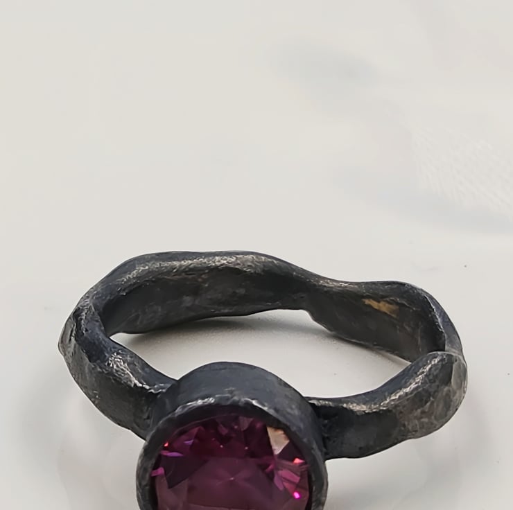 Illuminate your style with the vibrant charm of the Rosy Radiance Forged Silver Ring, featuring a dazzling bright pink faceted cubic zirconia delicately set within a handmade forged silver band.