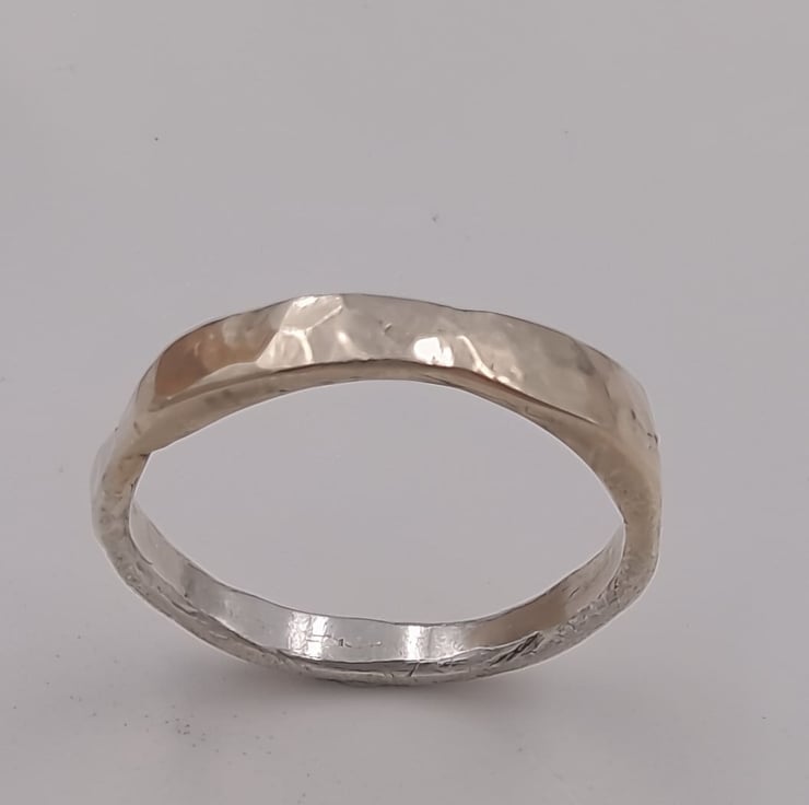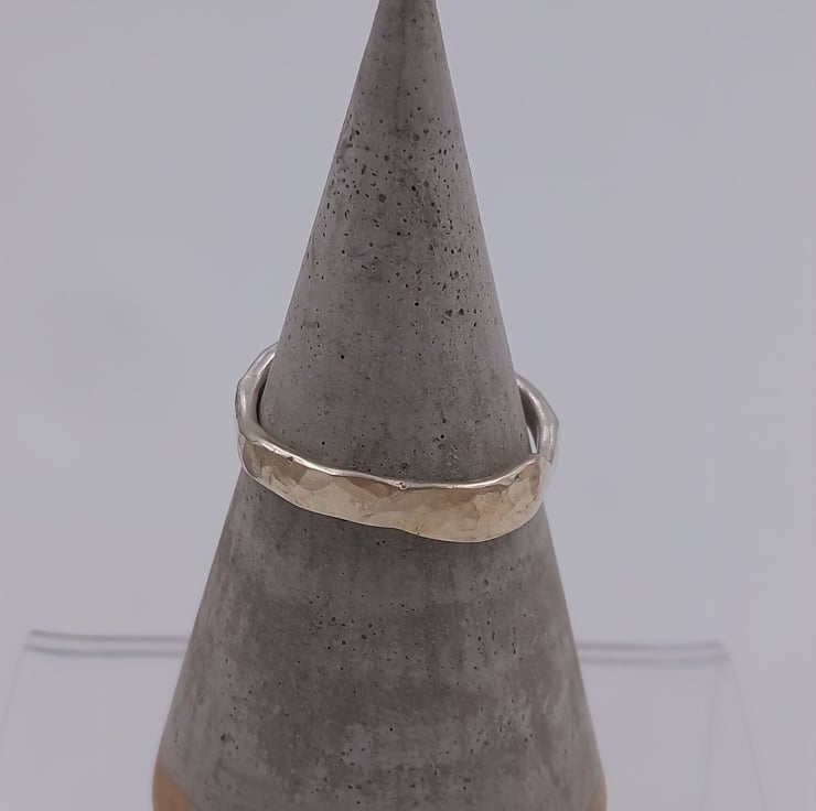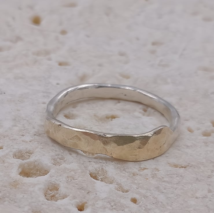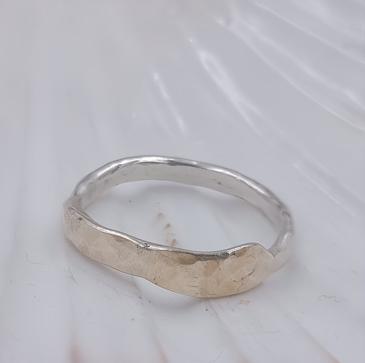 Discover the perfect harmony of luxury and craftsmanship with the Golden Fusion Hammered Silver Ring. This ring combines the warmth of 9ct gold with the rugged beauty of sterling silver, resulting in a truly breathtaking piece of wearable art.