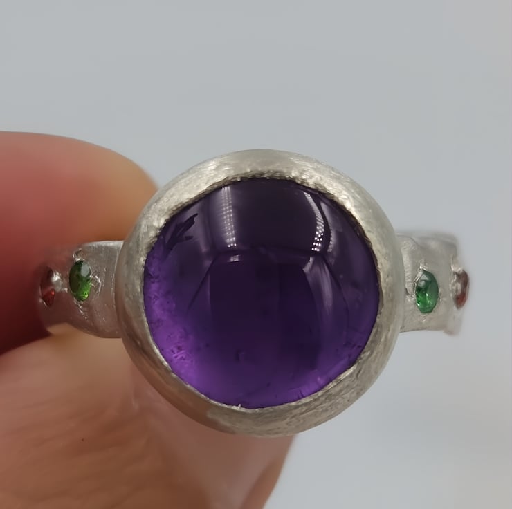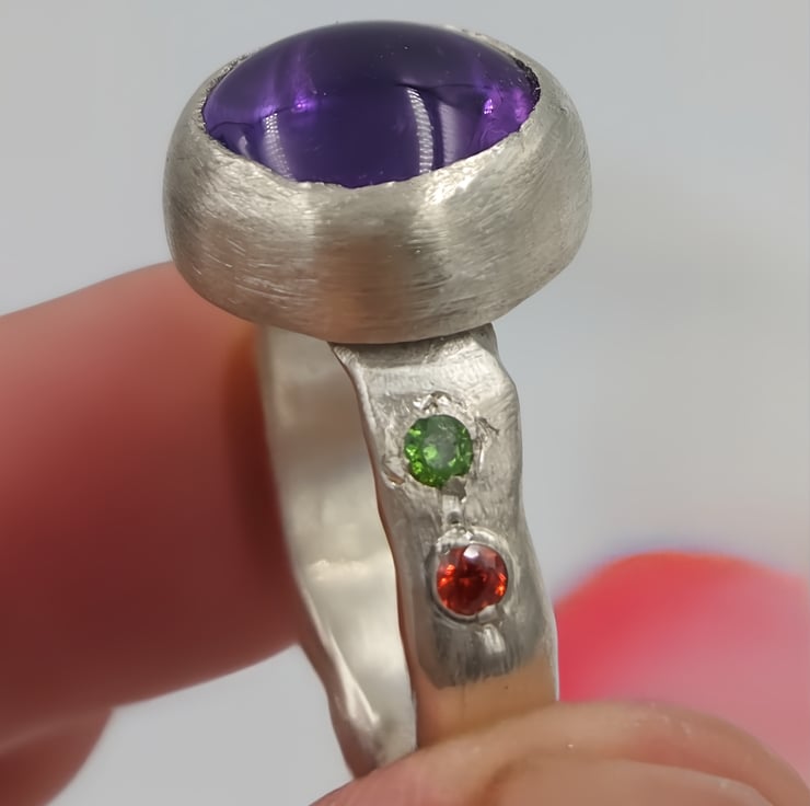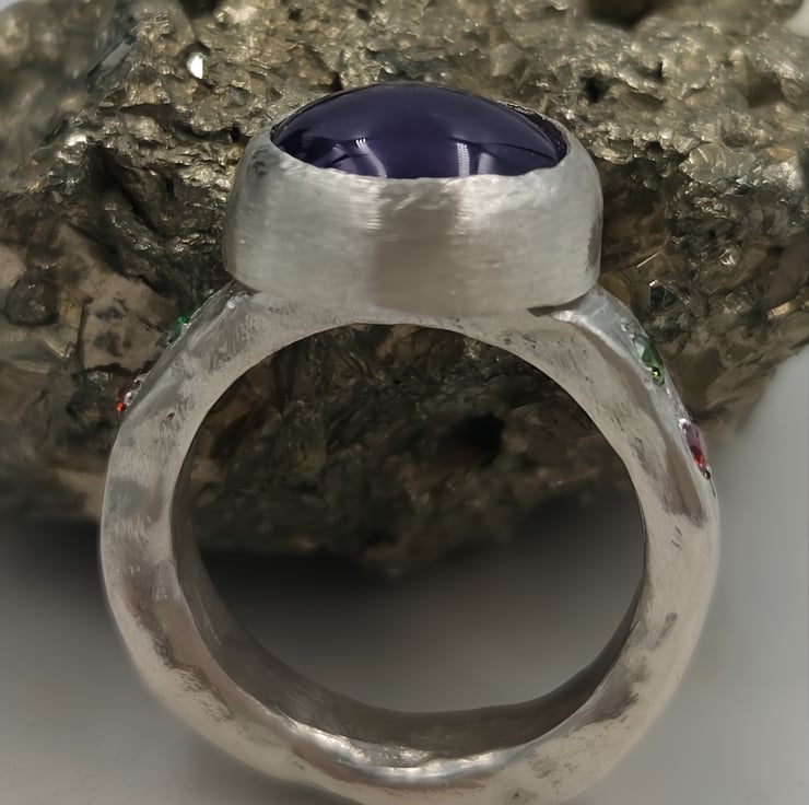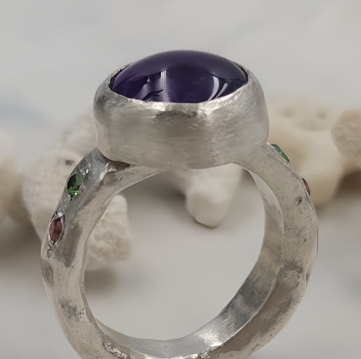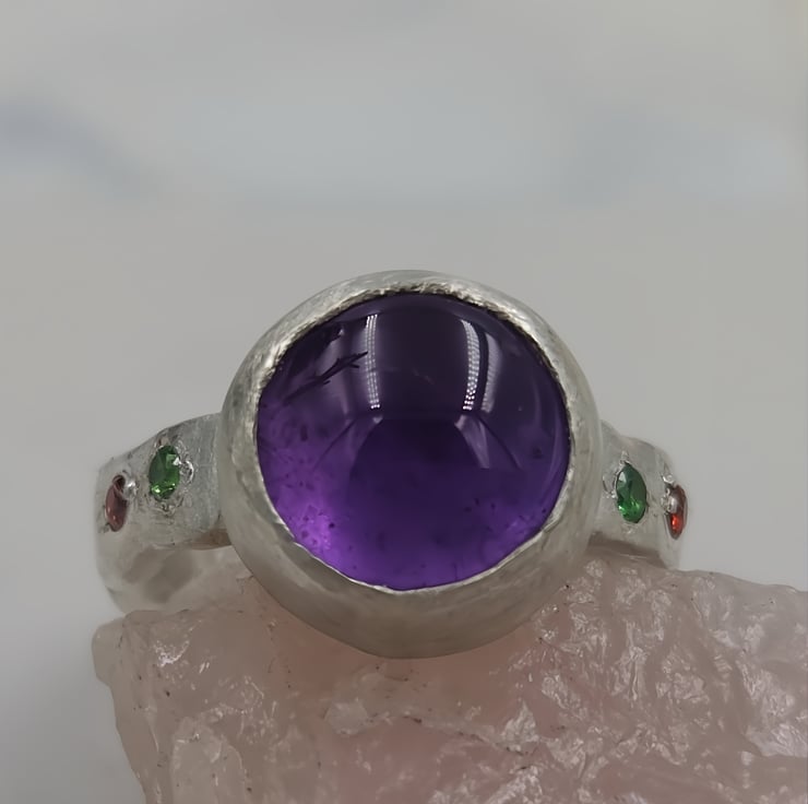 Embrace the enchanting allure of the Mystic Majesty ring, a bold piece that exudes mystical charm. This stunning ring features a large amethyst cabochon at its centre, radiating a deep purple hue that symbolises tranquility and spiritual wisdom. Flanking the amethyst are two red and two green 2mm cubic zirconia (CZ) gems, adding a touch of vibrant sparkle and a striking contrast to the rich purple stone.
