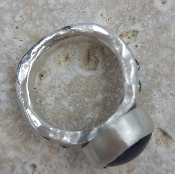 Crafted from chunky molten silver, the band showcases a unique, organic texture that enhances the ring's distinctive and modern appeal. The molten silver's flowing design complements the natural beauty of the gemstones, creating a harmonious blend of elegance and artistry. Perfect for making a statement, the Mystic Majesty ring is an ideal accessory for any occasion, whether it's a casual day out or a glamorous evening event.