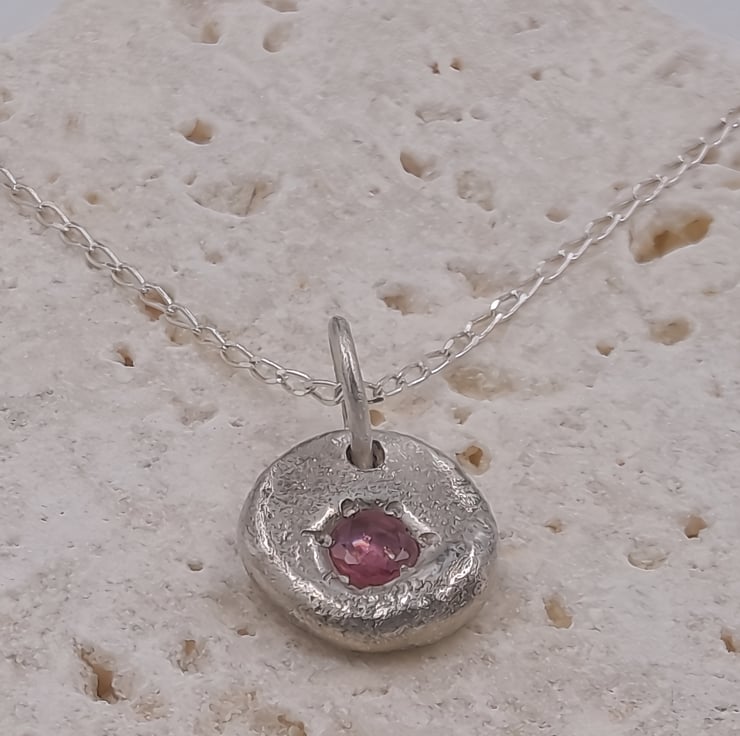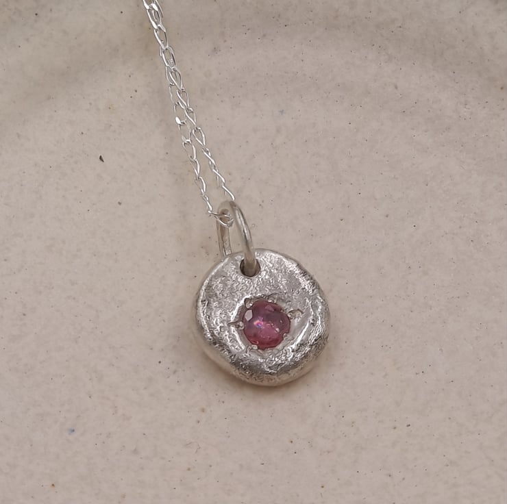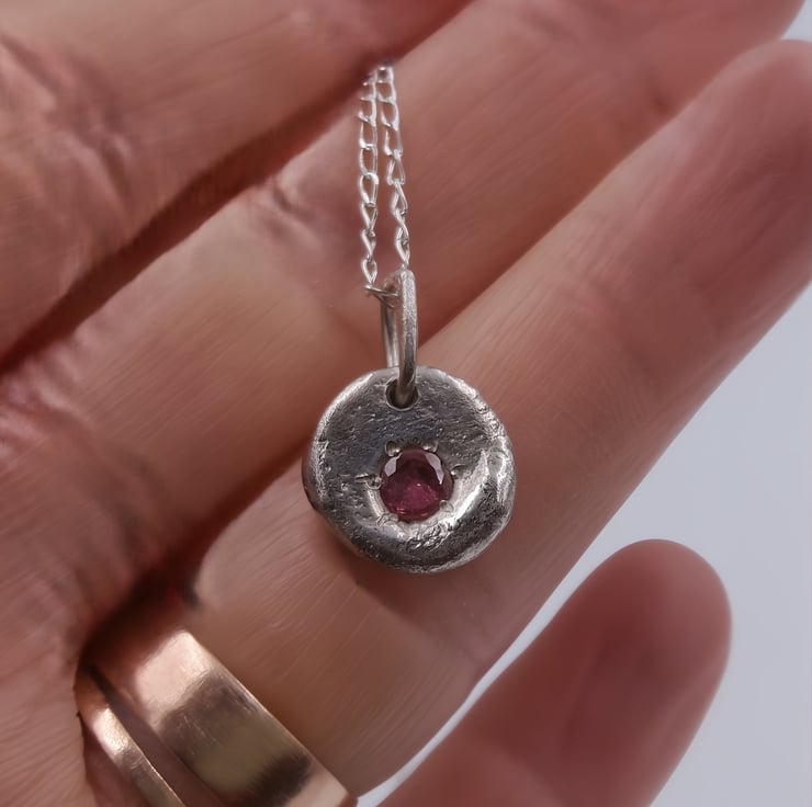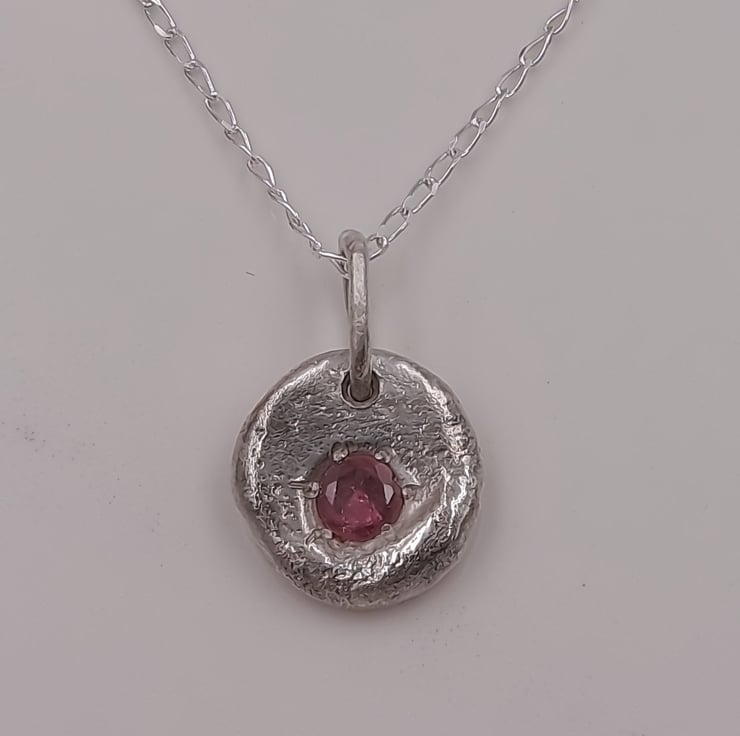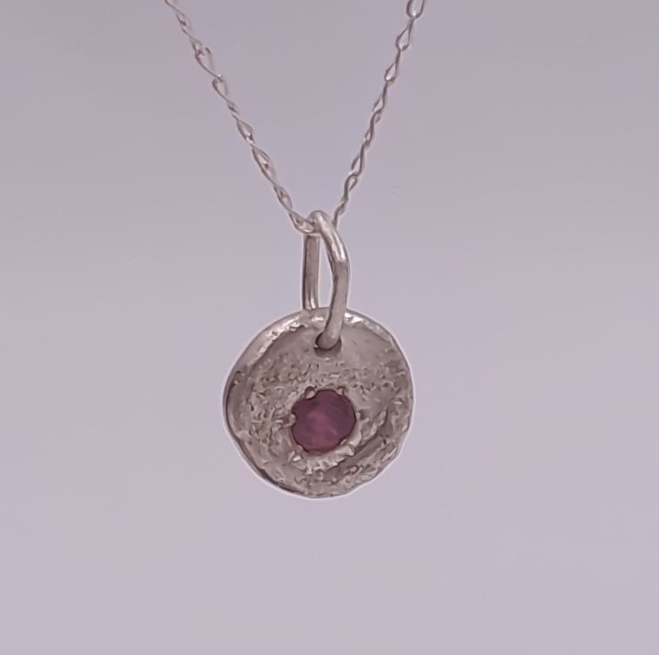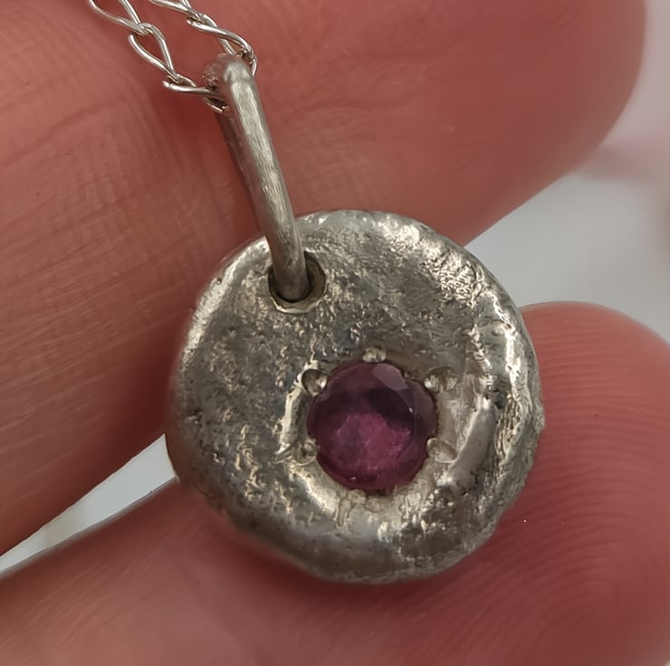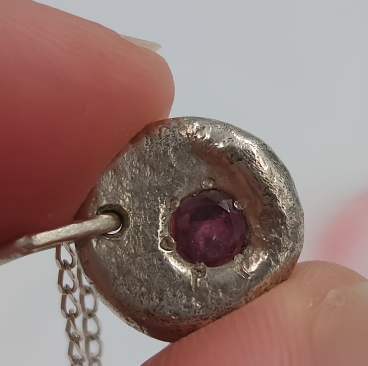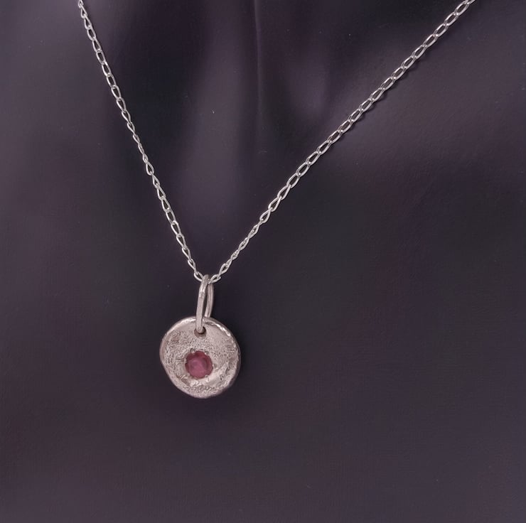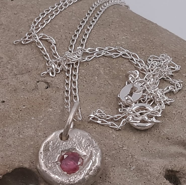 A stunning Silver Pendant, featuring a molten-set faceted ruby at its heart. Crafted with precision and passion, this pendant embodies elegance and sophistication, perfect for any occasion.