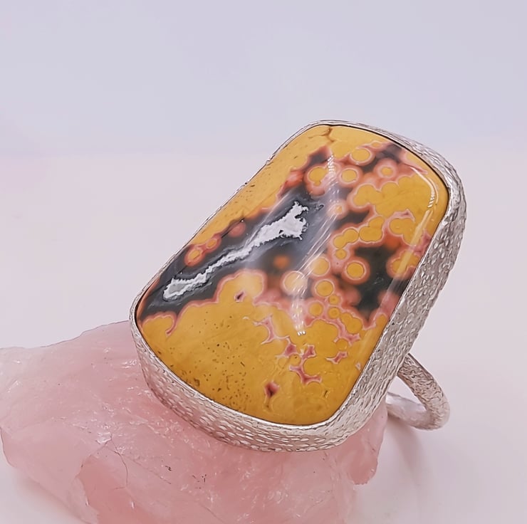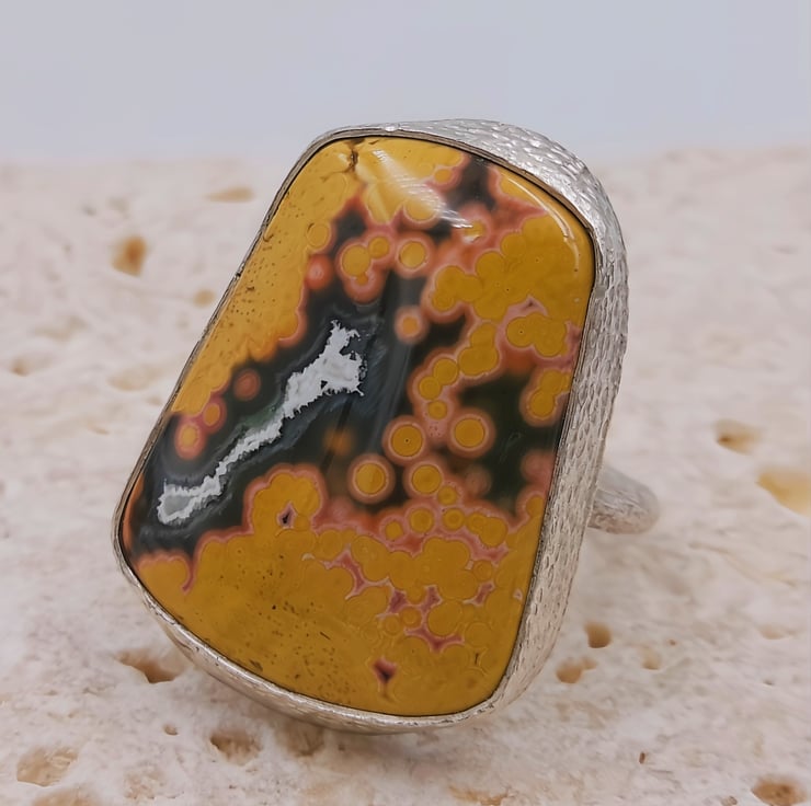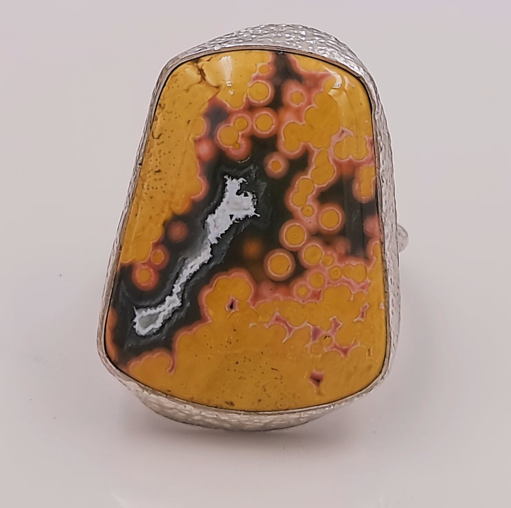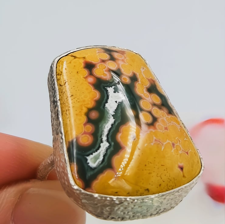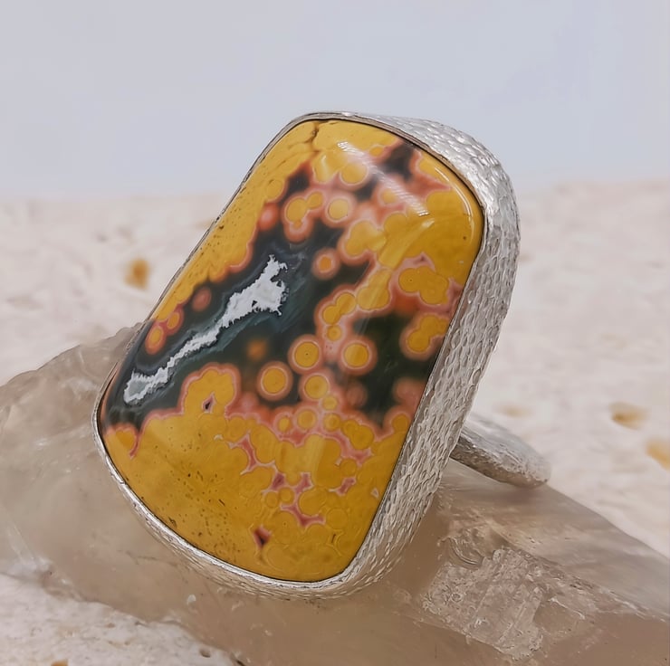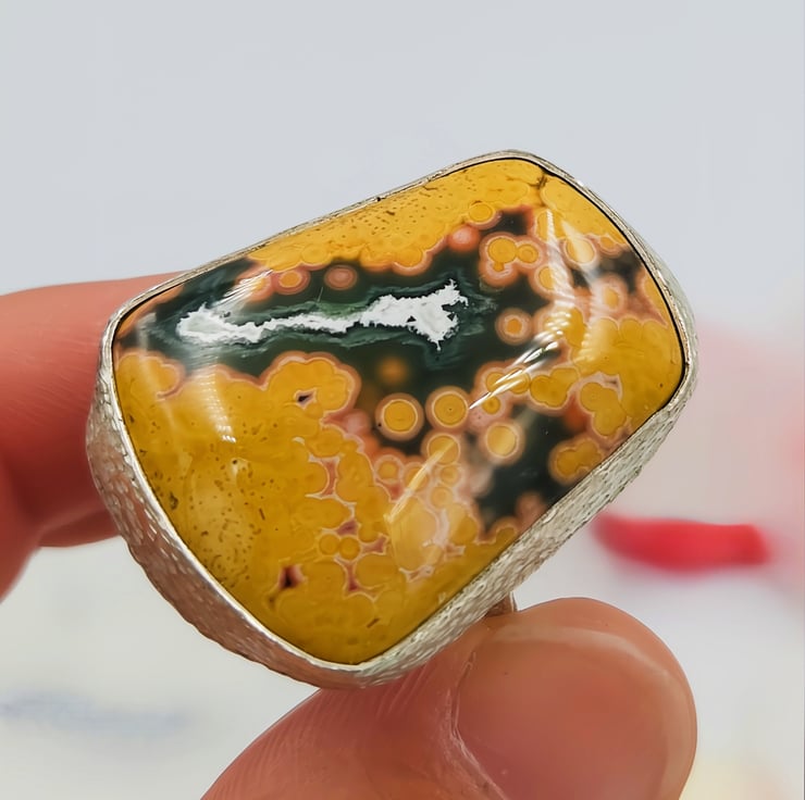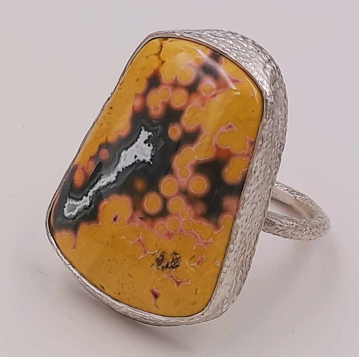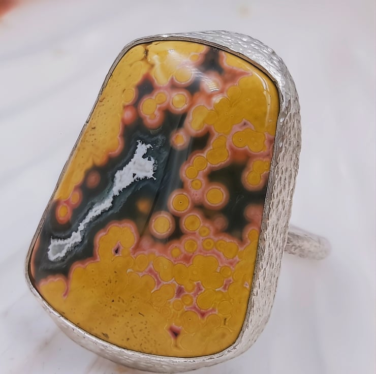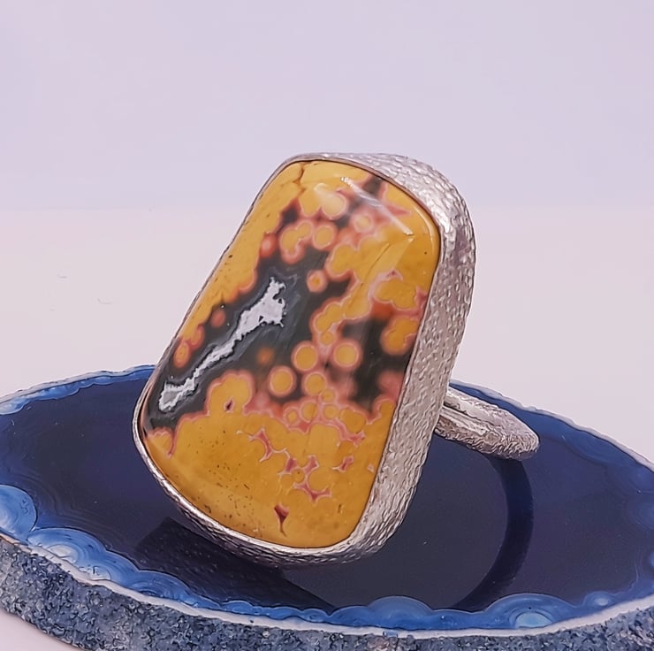 Introducing the Sunburst Jasper Fusion Ring, where the vibrant energy of a vivid yellow oceanic jasper tumbled stone meets the artistry of handcrafted silver.
