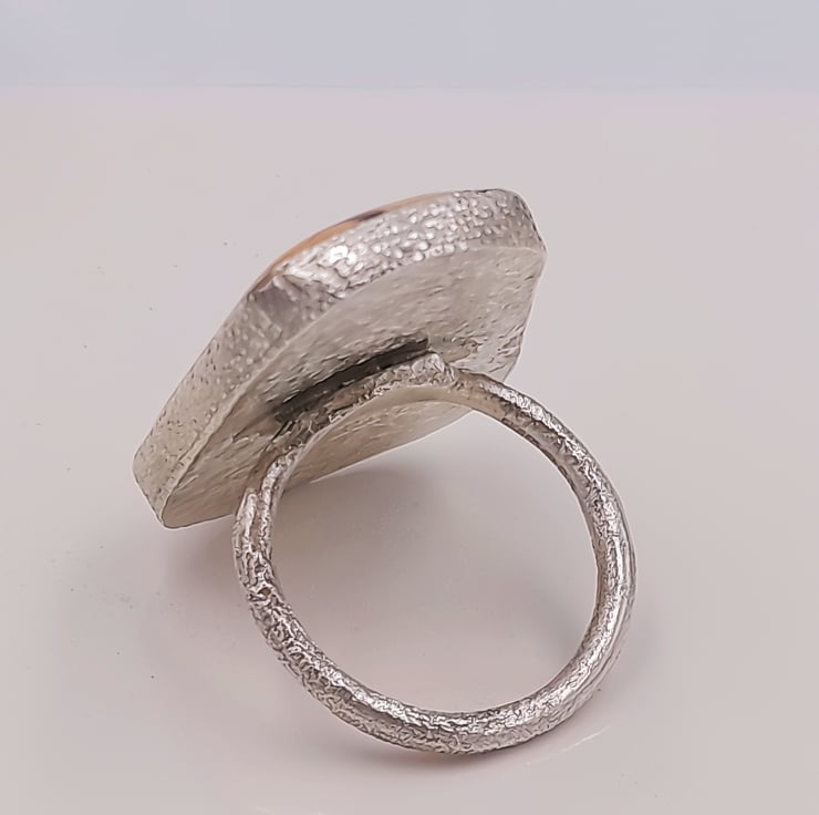 The ring shank, forged from silver, adds a touch of organic elegance with its unique texture and fluid silhouette.