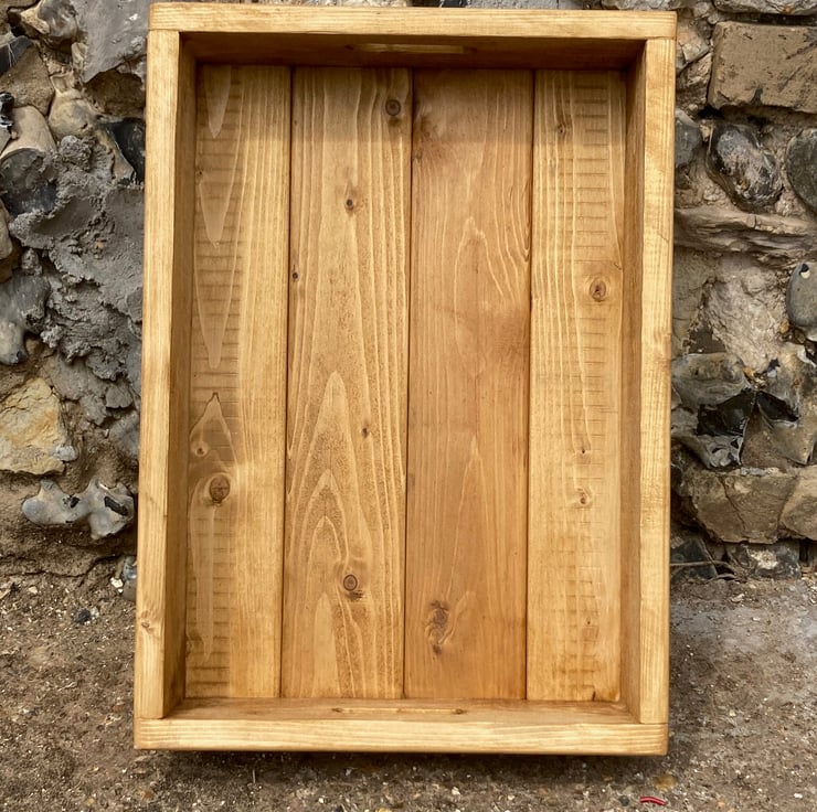 These trays are handmade, to order, in my workshop in rural Suffolk. You can have whatever size or finish that you want, just message me to discuss things that aren't listed. The ones pictures are finished in medium oak and clear varnish but you can have pretty much whatever you want.