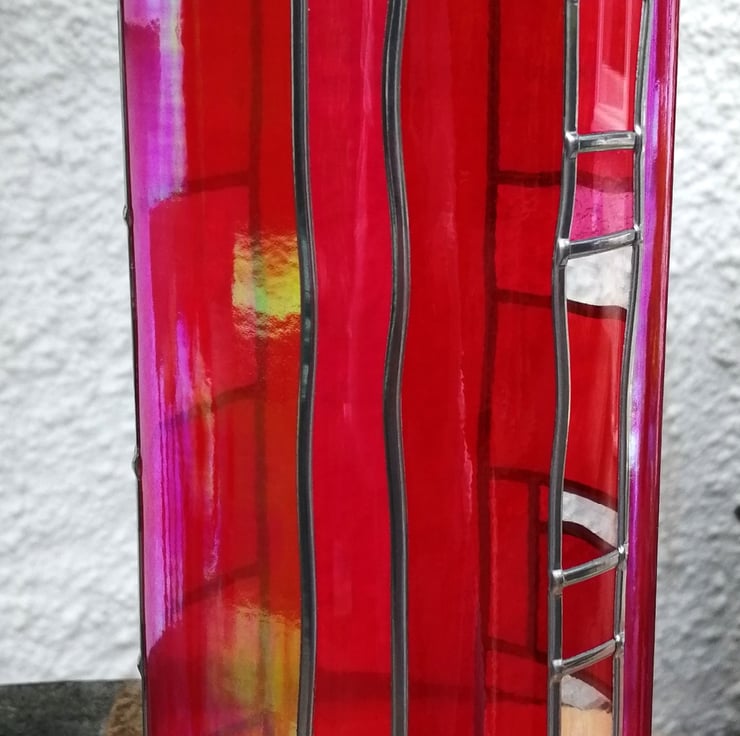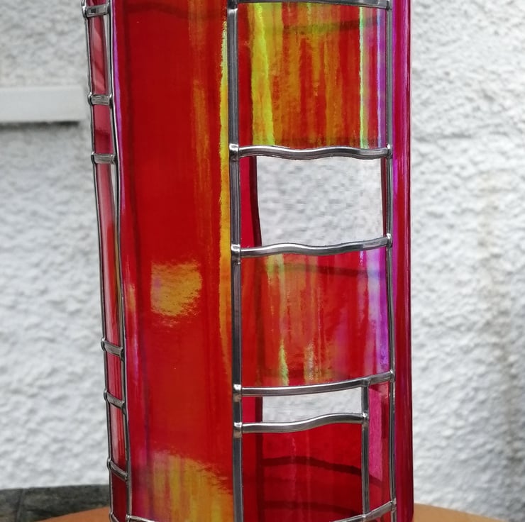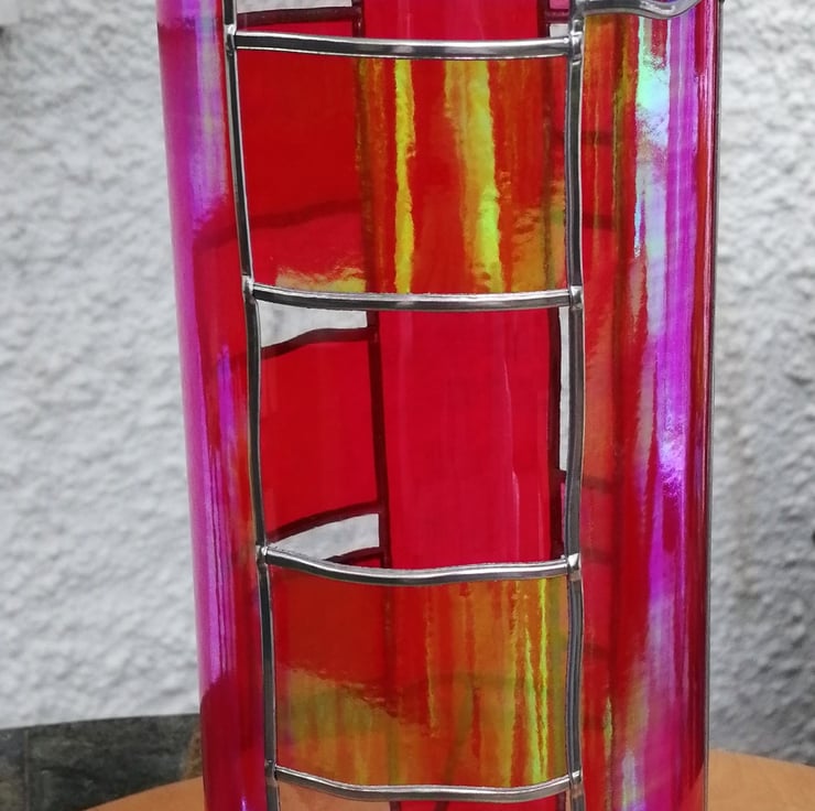 Pearlescent red blended with gold gives a shimmering, almost metallic effect. The colour changes from red to gold depending on the light, almost looks like dervish dancing flames. Vibrant red and pink complement this Art Deco design that wraps its way around the vase.