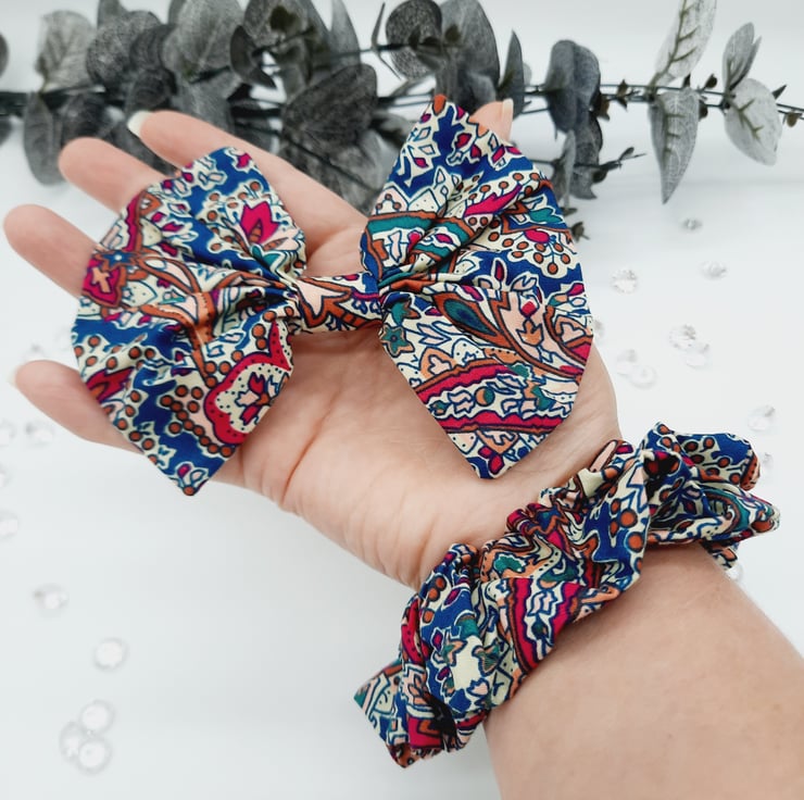 Raspberry pink and teal clip on bow and scrunchie matching set.