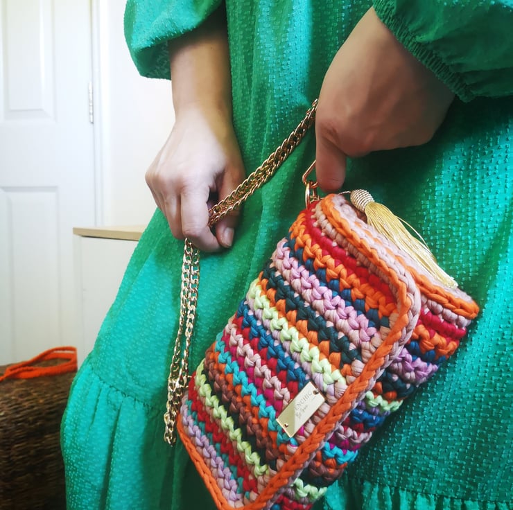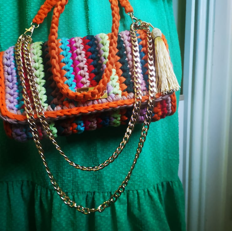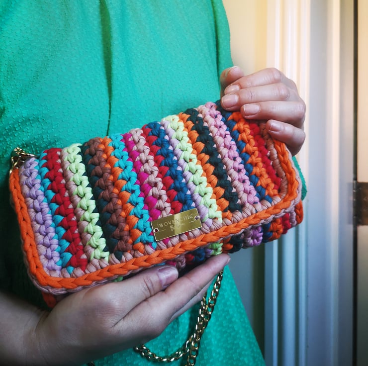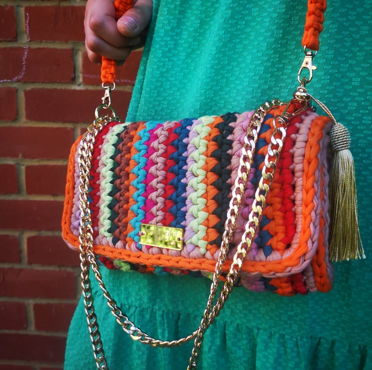 Handmade crochet colorful bag, made from premium quality cotton t shirt yarn.