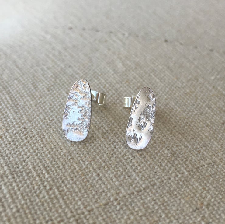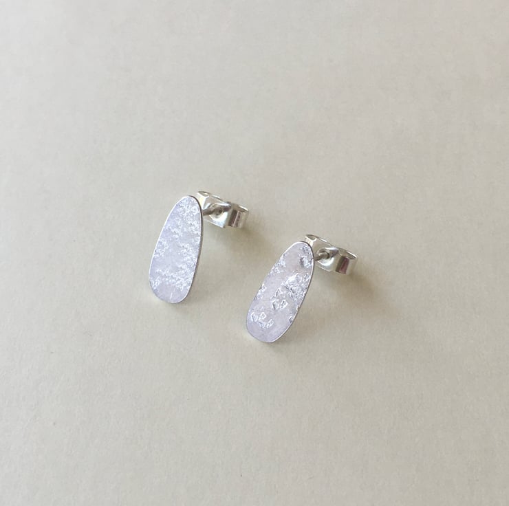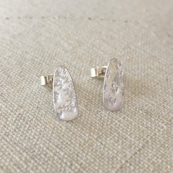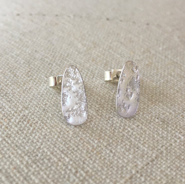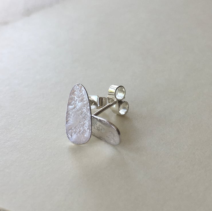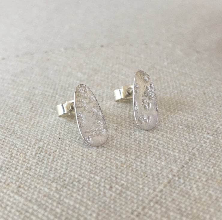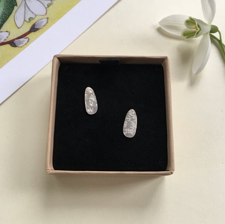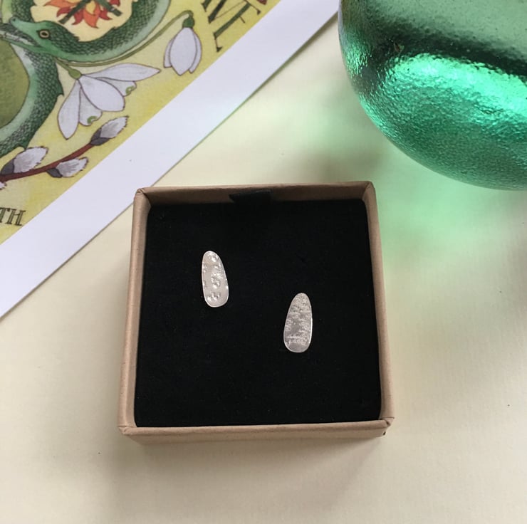 I begin by drawing each standing stone by hand, then cutting it out from recycled silver sheet using a jeweller's saw. Each one is textured using a hammer, and finished by hand. Each little standing stone is different to the next, and I pair them up so that they create a slightly mismatched pair of stud earrings, which is completely unique.