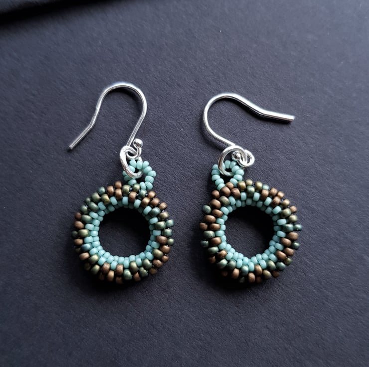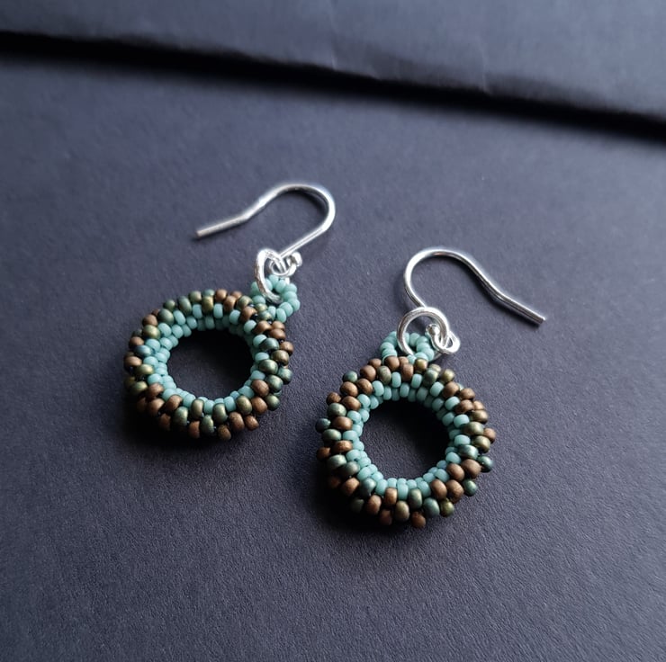 These lovely little earrings consist of hand stitched loops in lovely earthy tones. The loops hang from sterling silver ear hooks. The loops are made from glass beads, hand stitched together with a needle and thread. Lovely light weight earrings, perfect for everyday wear. I only use the highest quality beads and thread in my work.
