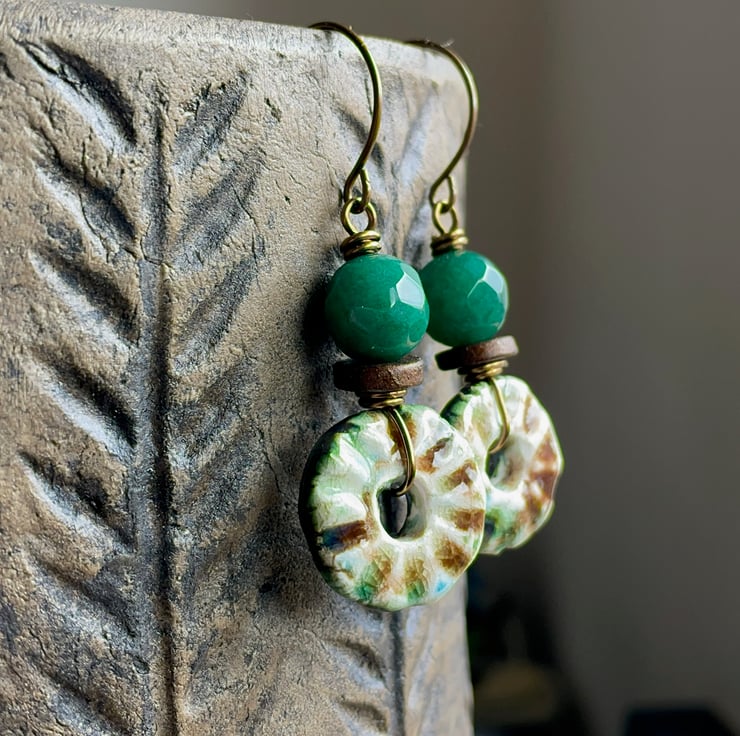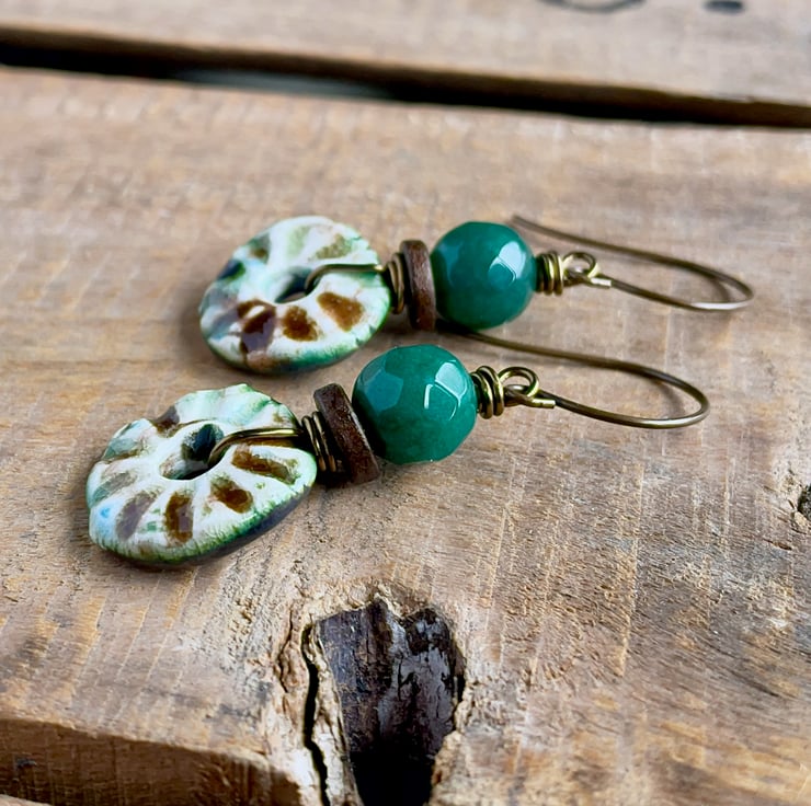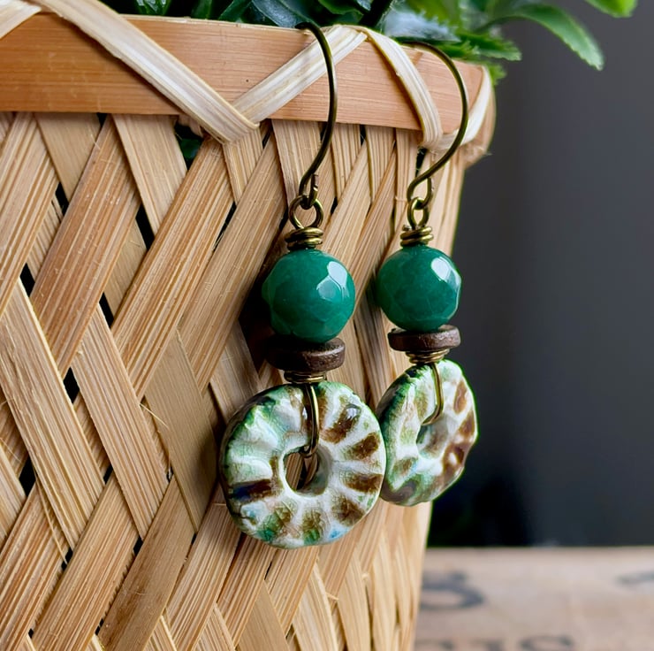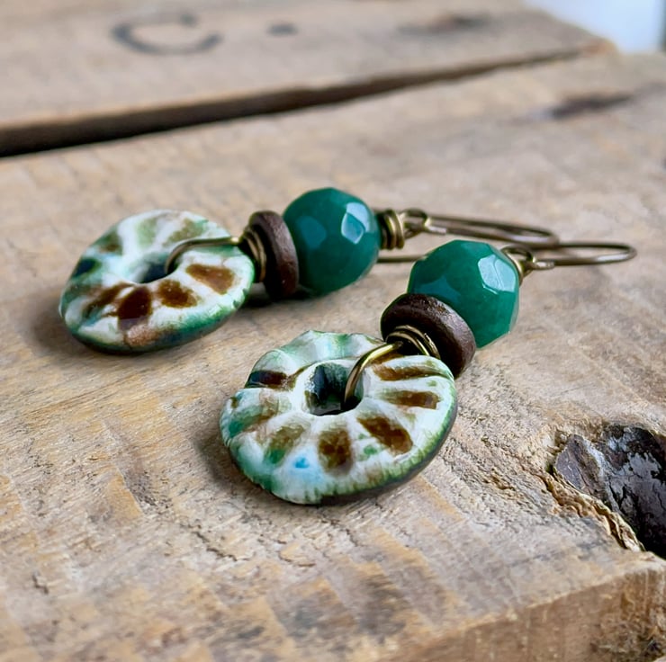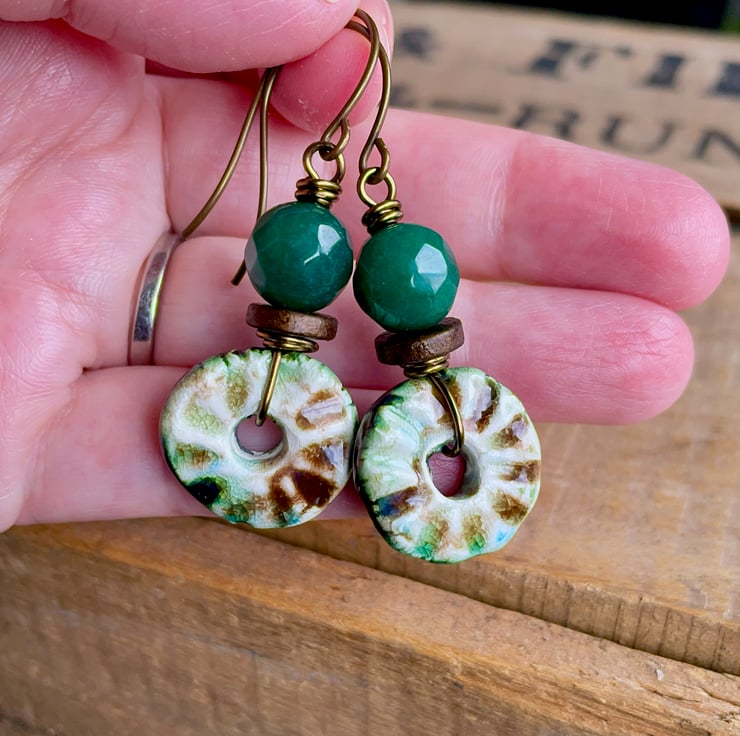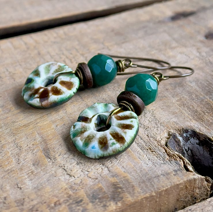 Rustic Green & Brown Artisan Ceramic Disc Earrings. One of a Kind Jewellery
