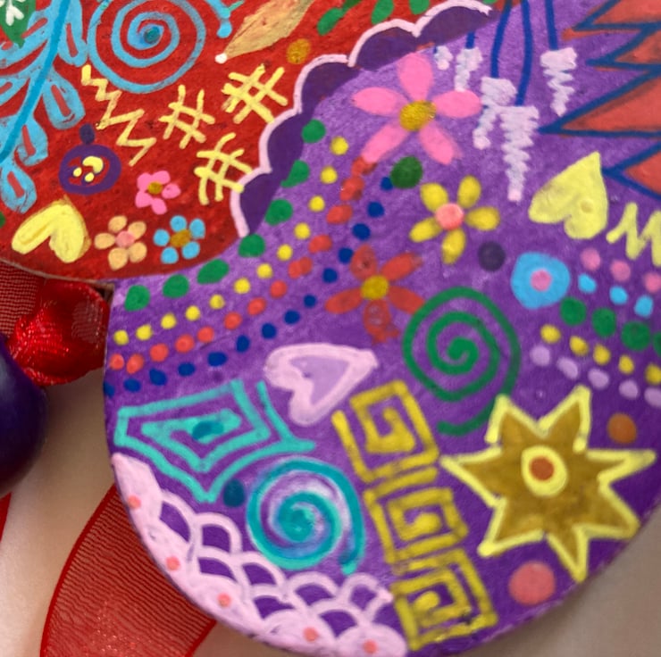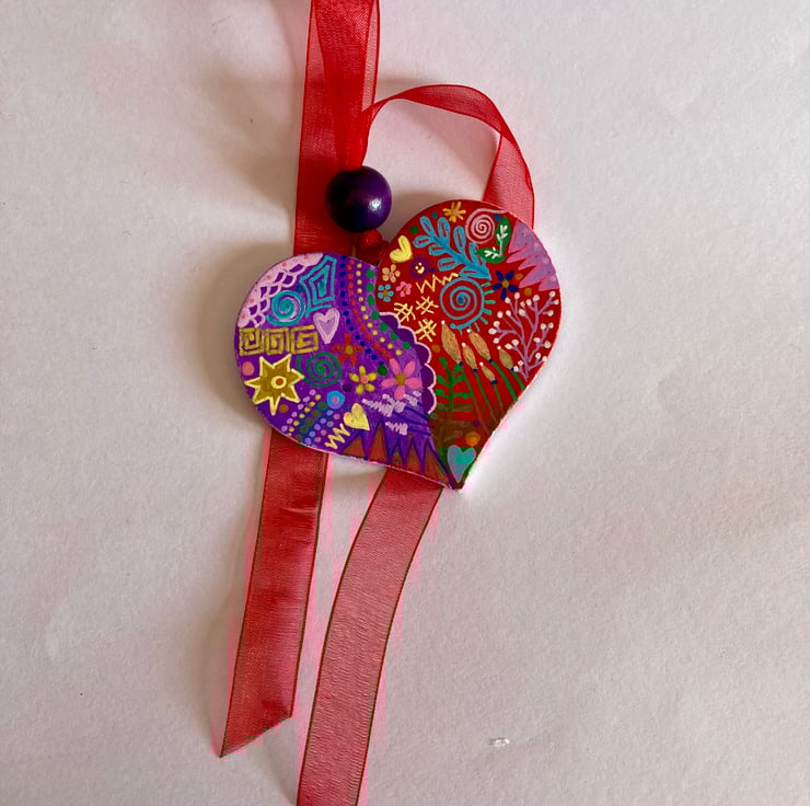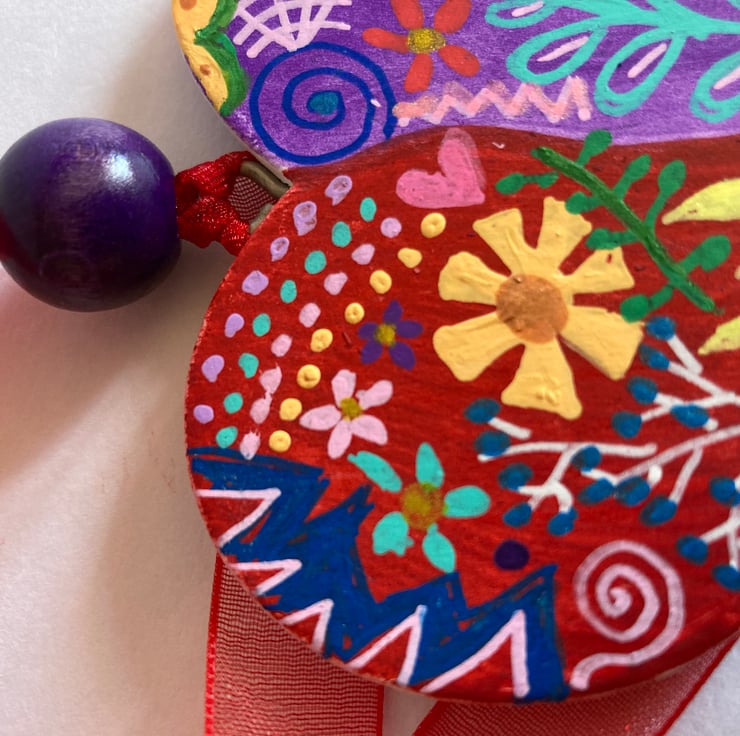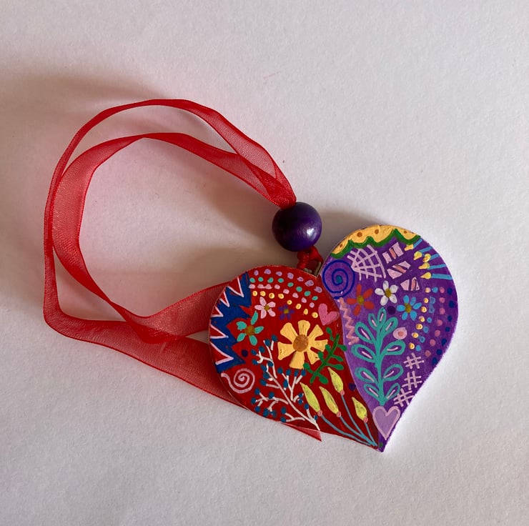 Both sides of this wooden heart have been hand painted in a variety of colours and varnished.