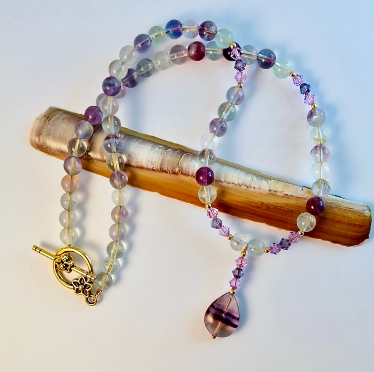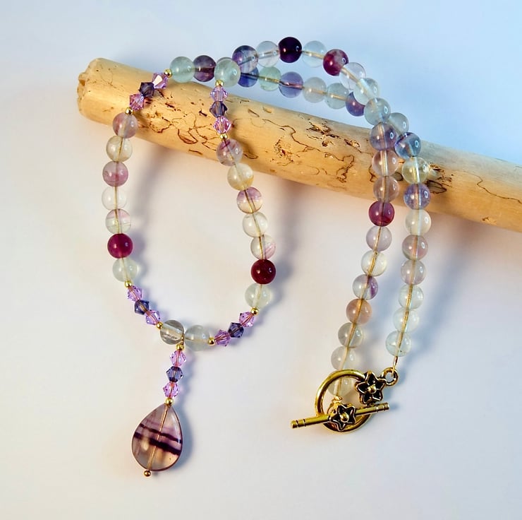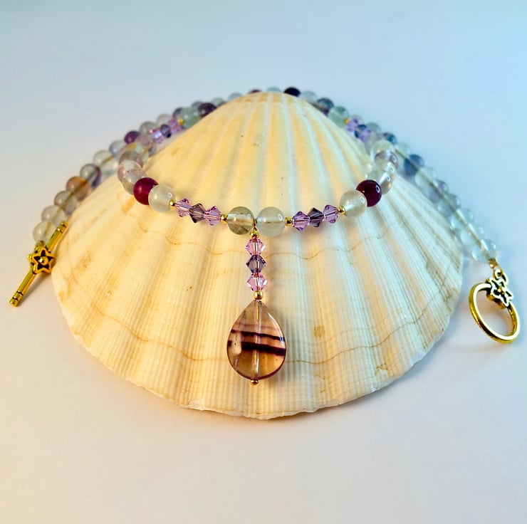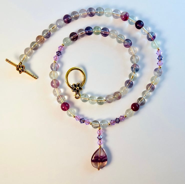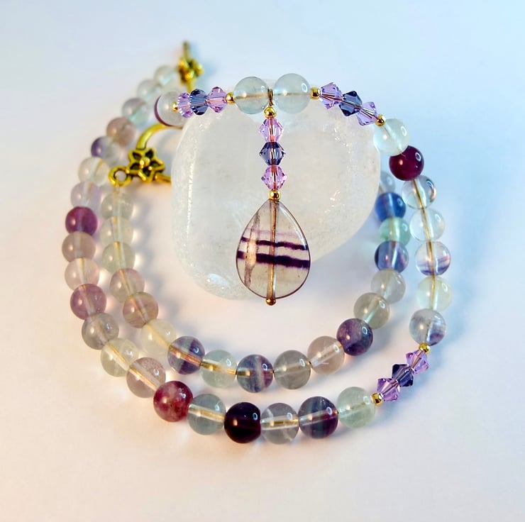 The body of the necklace is made up of 6mm Fluorite beads and trios of 4mm Austrian crystals to match the pendant.