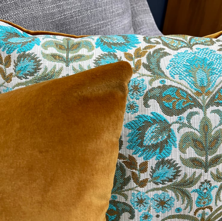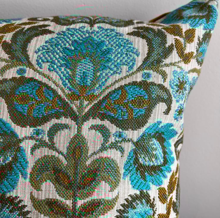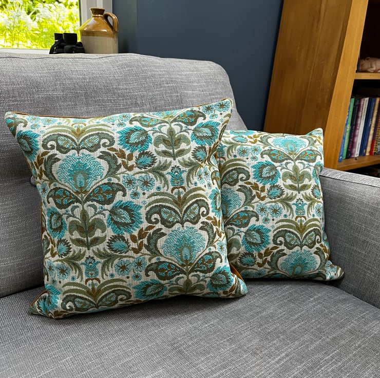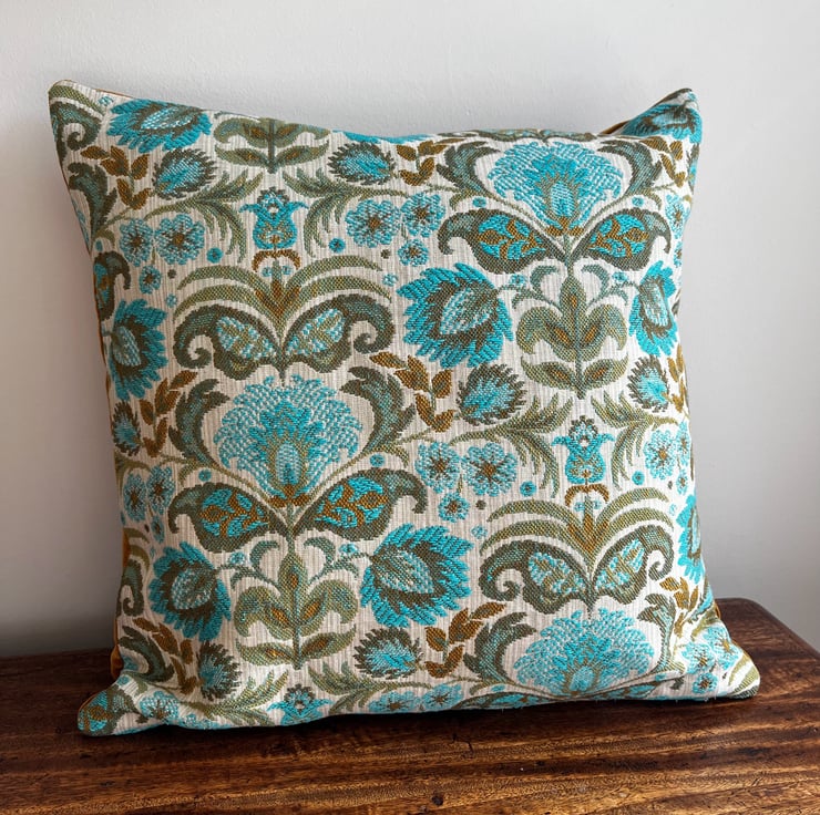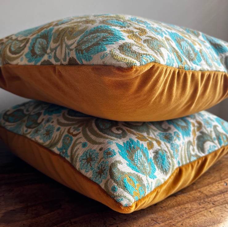 Beautiful Belgian tapestry cushion cover. This beautiful tapestry fabric was imported by John Lewis in the sixties. I have backed the cover with amber coloured velvet for a luxurious finish and the cover fastens with a zip in the bottom seam.